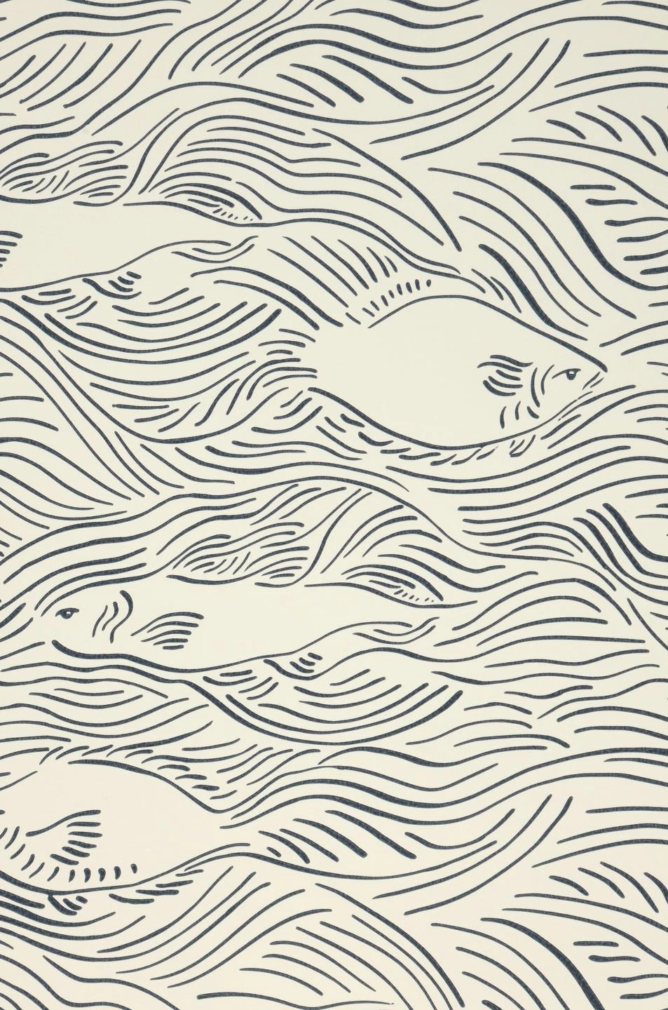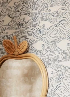 War da ein Fisch? Schon ist er im Bach weiter geflitzt. Das Design der Tapete aus dem Hause Ferm Living setzt den Eindruck beim Betrachten eines fischreichen Flüsschens künstlerisch um. Zwischen den wie handgezeichnet wirkenden Wellenlinien, die die bewegte Wasseroberfläche nur andeuten, entstehen verschiedene Fische nur aus wenigen Umrissen und Aussparungen. Die monochrome Farbgebung aus anthrazitfarbenen Linien auf cremeweißem Grund unterstreicht die raffinierte Wirkung.