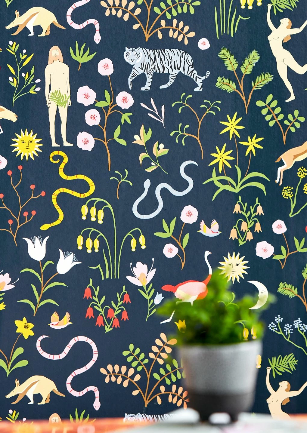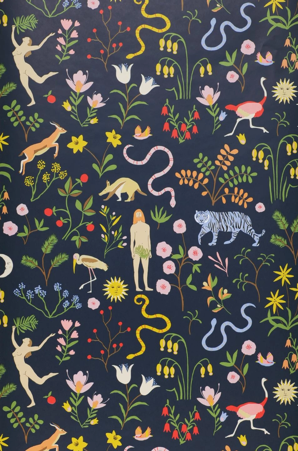 Mit dieser außergewöhnlichen Vliestapete machen Sie Ihre vier Wände zu Ihrem ganz persönlichen Paradies! Seite an Seite mit Adam und Eva gibt es hier Tiger, Strauße, Singvögel und natürlich Schlangen. Blühende Blumen, Büsche und Bäume wachsen, vom Himmel scheinen die Sonne und der Mond. Auf dem stahlblauen Untergrund gewinnen die bunten Farben der Motive strahlende Leuchtkraft und verströmen gute Laune.