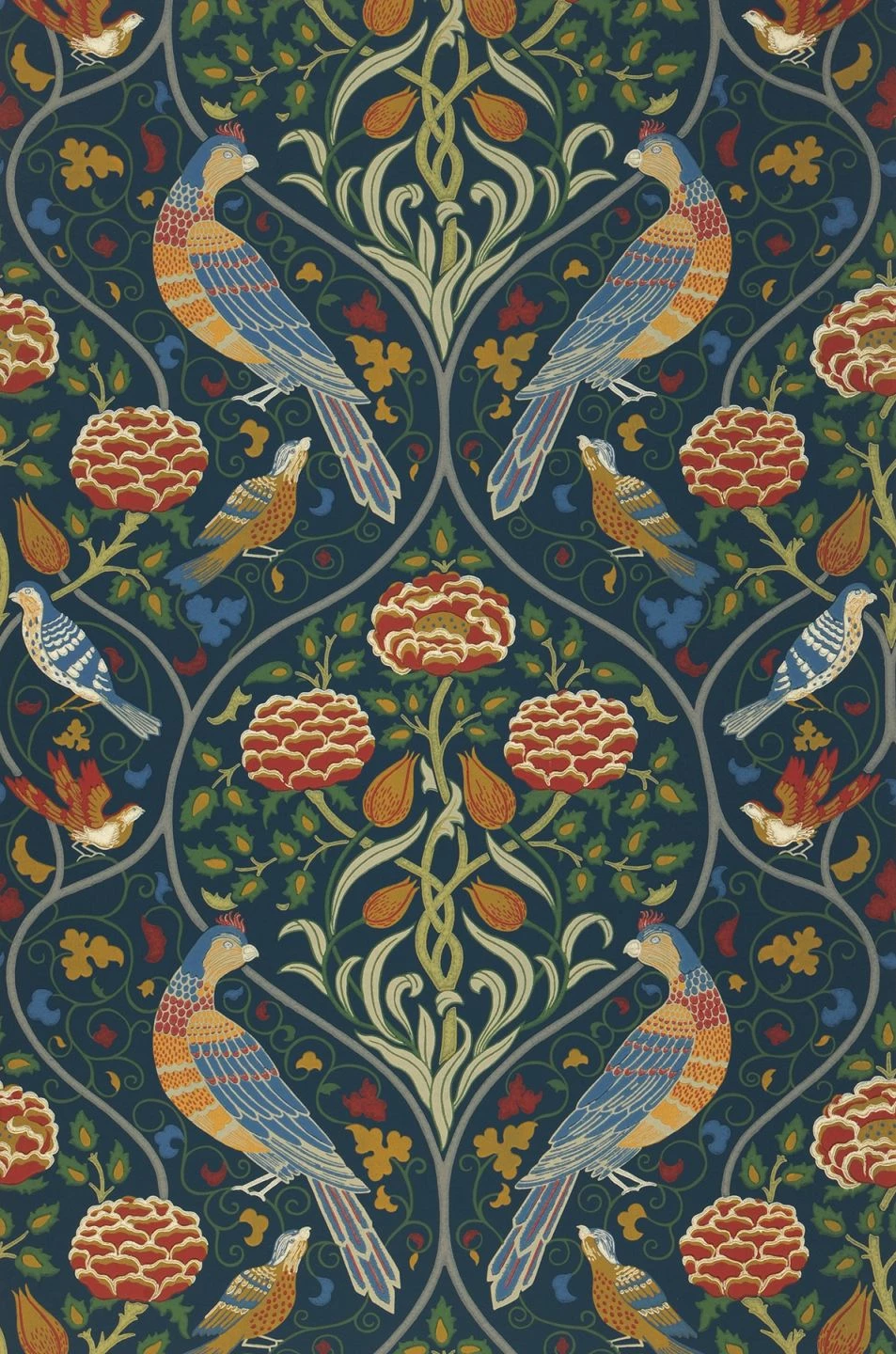 Der Zaubergarten des Jugendstils, wie er aus der Feder des Jugendstil-Künstlers Heinrich Vogeler stammen könnte, öffnet mit satten Farben wie Grün, Rot, Azurblau seine Tore für einen Spaziergang in die Fantasie. Durch die Leimdruck-Optik der glatten Papiertapete wird ein kunstvoller Gemälde-Charakter geschaffen.