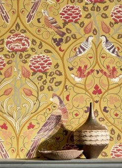 Die wunderbare Zeichenkunst des Jugendstils mit einer Fülle an Elementen, darunter paradiesische Vögel, Blüten und Ranken, verleiht dem Raum einzigartige Schönheit. Gold, Brauntöne, Violett und Rosenholz unterstreichen den warmen Charakter. Die matte Leimdruck-Optik betont die erlesene Qualität der edlen Papiertapete.