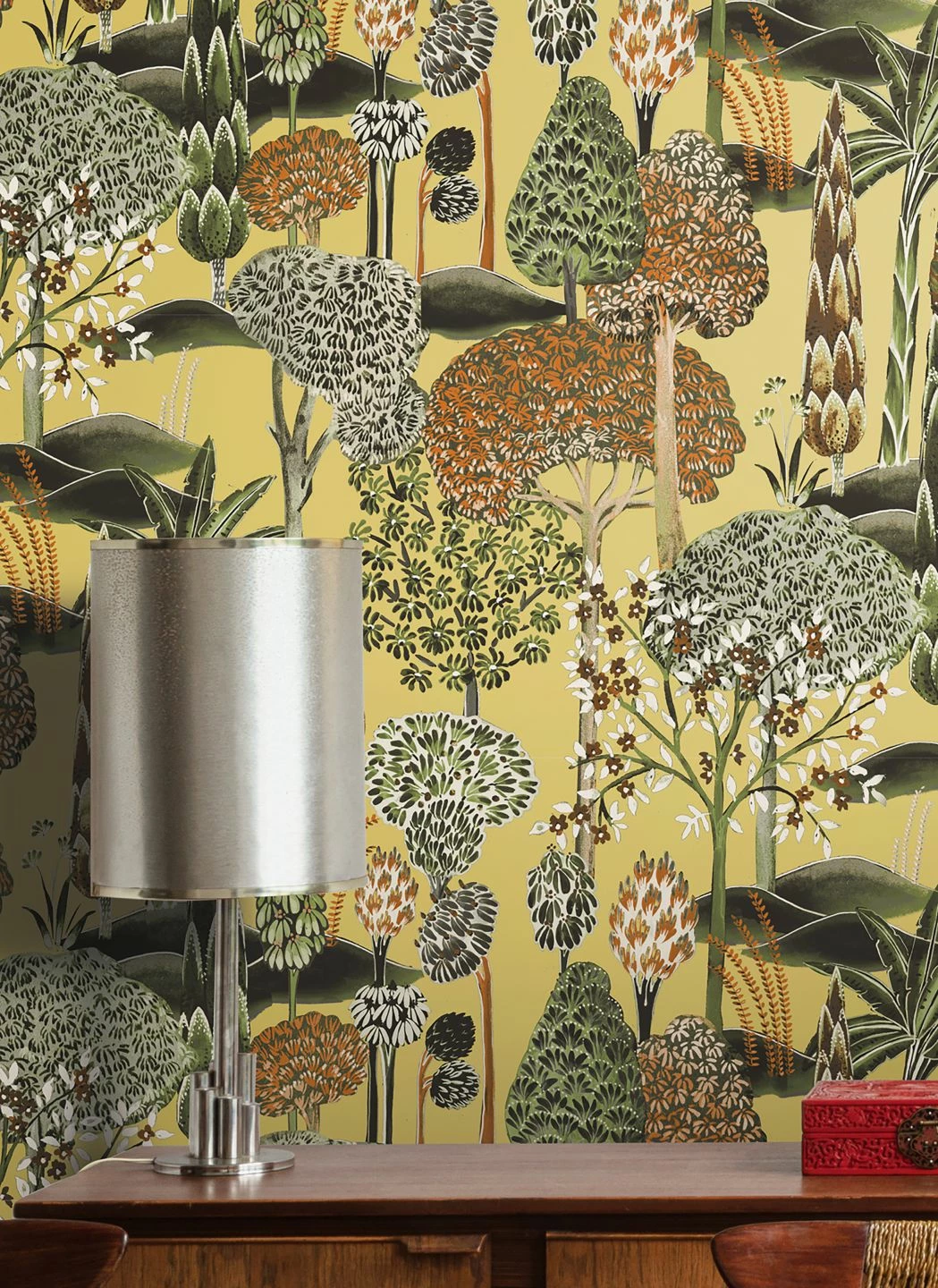 Ein Wald aus den unterschiedlichsten Laubbäumen ist das Thema der Vliestapete Akari. Erste Brauntöne mischen sich unter das Grün der Blätter und scheinen die beginnende Laubfärbung des Herbstes anzukündigen. Doch gleichzeitig erinnert der blassgelbe Grund an die warmen Sonnenstrahlen eines goldenen Oktobertags. Abwechslungsreich und voller Liebe zum Detail sind die verschiedenen Bäume dargestellt.