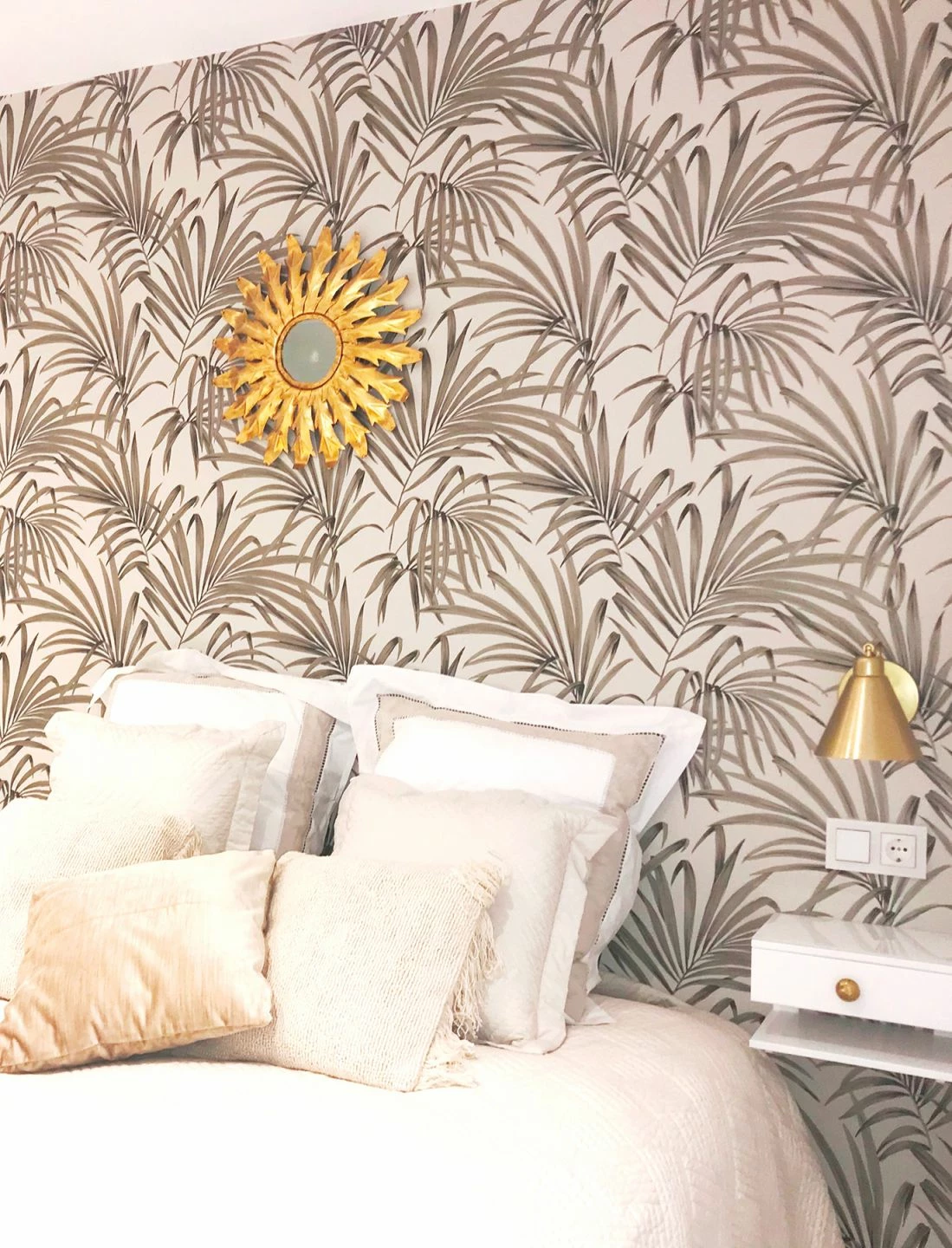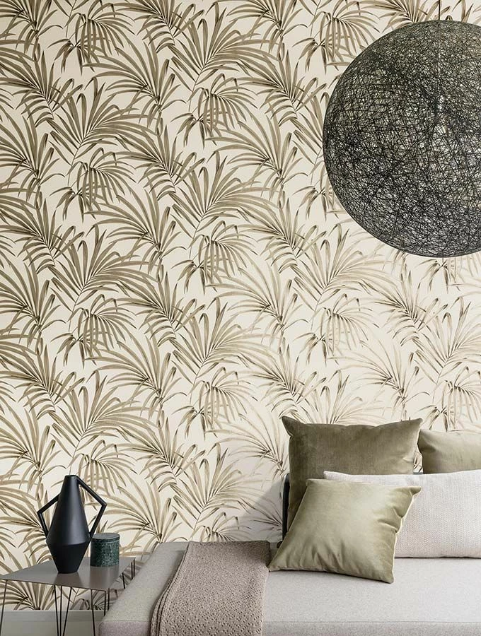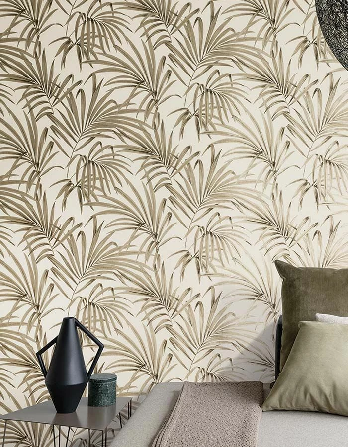 Weitsicht und Nahsicht eröffnen auf der floralen Muster Tapete ganz unterschiedliche Perspektiven. Die künstlerisch gestalteten Palmenzweige schimmern sanft, wenn das Licht sie berührt. Edle natürliche Raumkonzepte, die mit Exotik gewürzt sein sollen, haben an dieser Design Tapete ihre helle Freude.