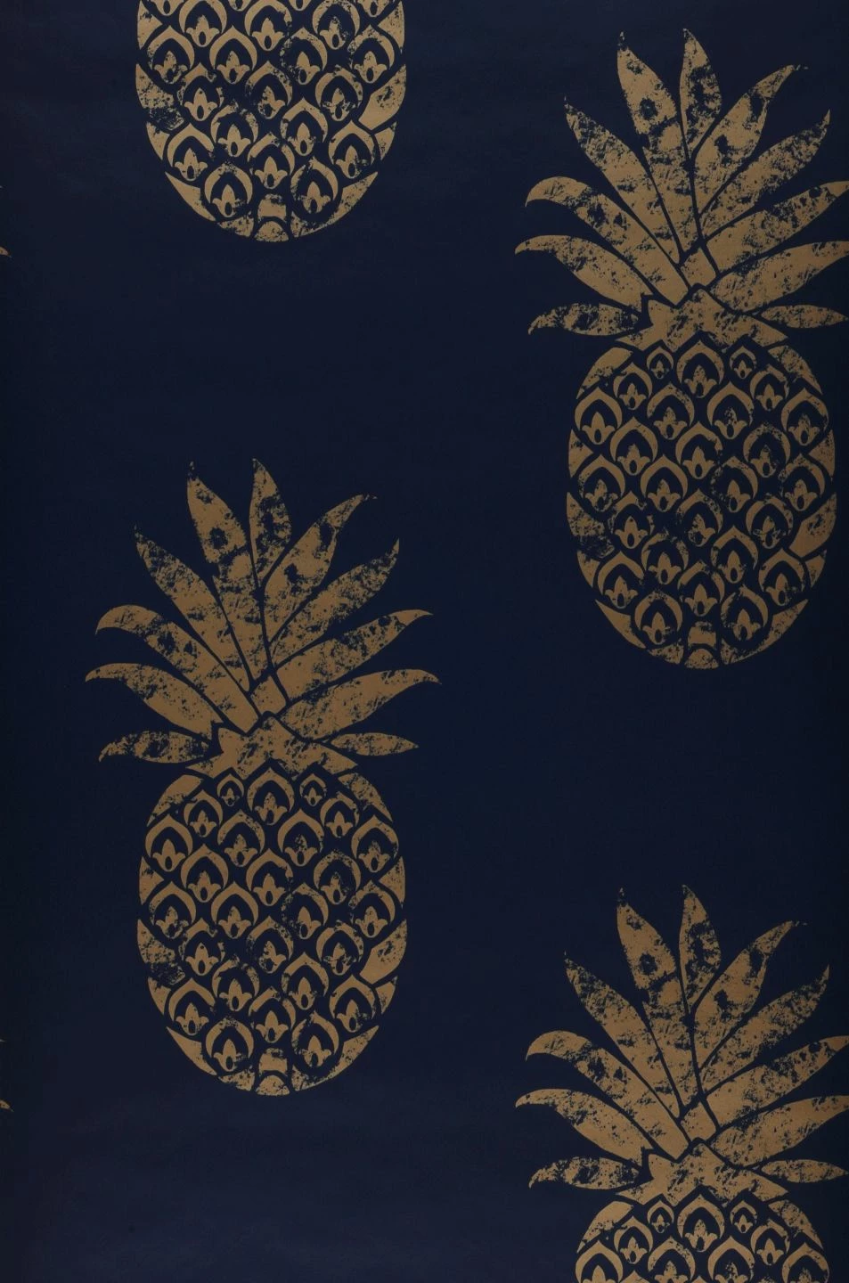 Die Verbindung von Blau und Gold steht für königliche Eleganz. Die schimmernd goldfarbenen Ananas auf dem tief saphirblauen Grund erhalten durch den Farbauftrag, der wie mit Stofffarben gestempelt anmutet, eine erfrischende Leichtigkeit. Die stilisierten Früchte erinnern an Ethno-Print-Muster auf traditionell hergestellten Stoffen und spenden Ihrem Raum einen Hauch von Luxus und eine Portion Exotik.