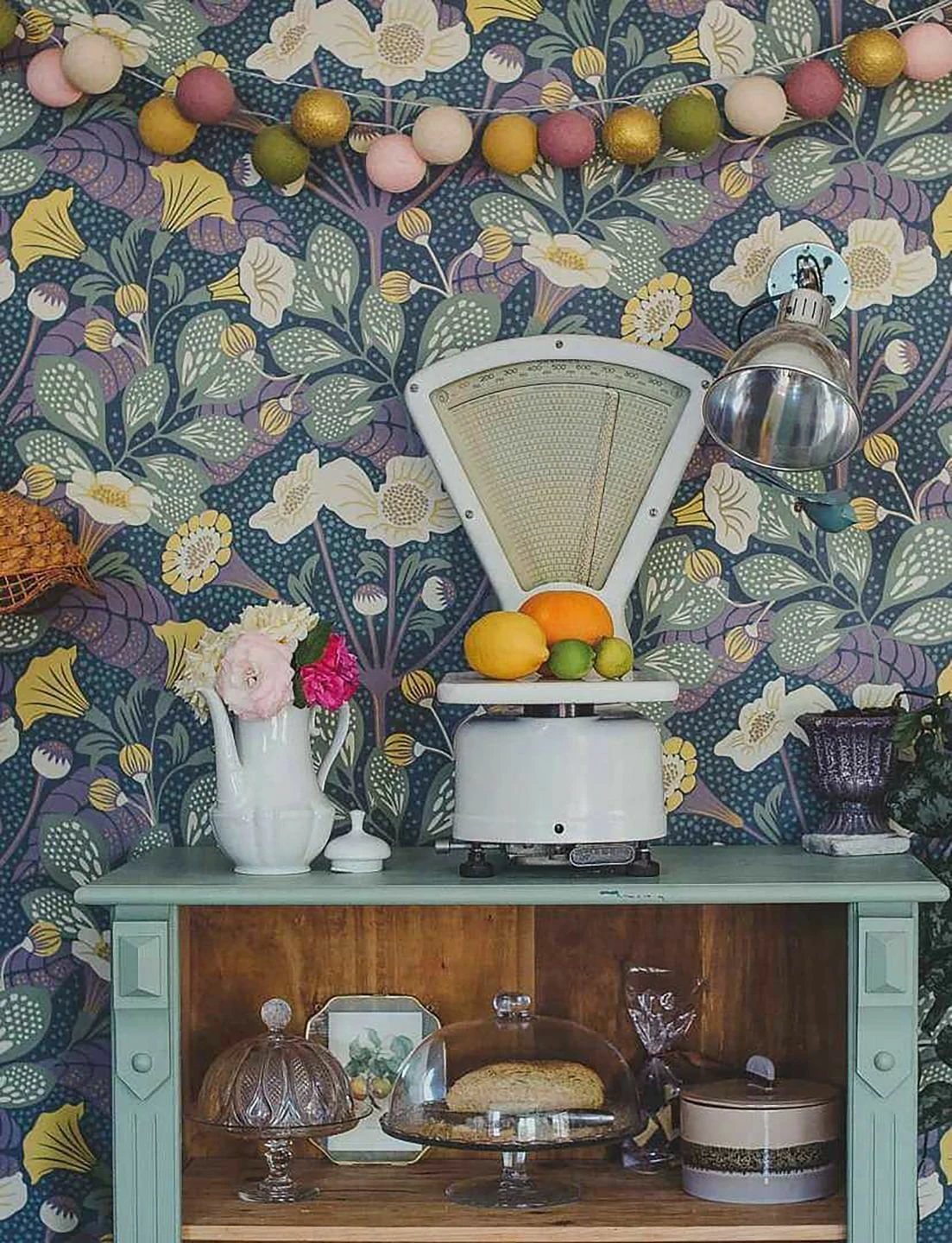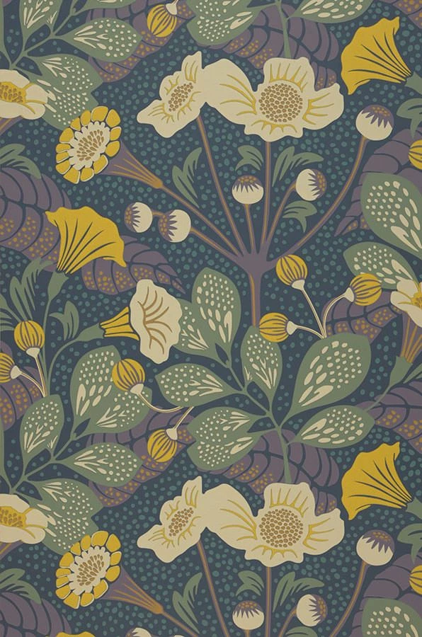 Mit musikalischer Note lenkt die florale Muster Tapete den Blick auf Trompetenblumen, die sich in ihren verschiedenen Blühstadien zeigen. Die stilisierten Blätter und der punktierte Blütenstaub im Hintergrund schwingen fröhlich mit. Die Textur aus Graublau und den Musterfarben in Blassgrün, Gelb, Hellelfenbein, Rotlila verleiht beschwingte Tiefe.