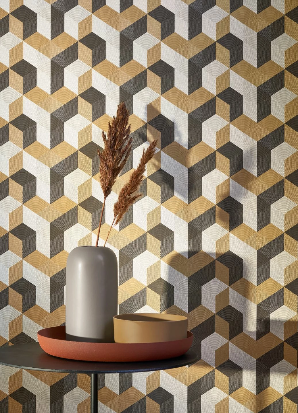 Faszinierende Geometrie verwandelt die Fläche Ihrer Wand in ein dreidimensionales Gebilde aus Würfeln, Kanten und Stufen. Fast wie in einer Zeichnung von M. C. Escher bewirkt die Anordnung der geometrischen Elemente gemeinsam mit der ausgeklügelten Verteilung der Farben die Illusion von räumlicher Tiefe. In die Vinyloberfläche eingearbeitet ist eine feine Struktur aus Schraffuren, die den Effekt noch verstärkt.