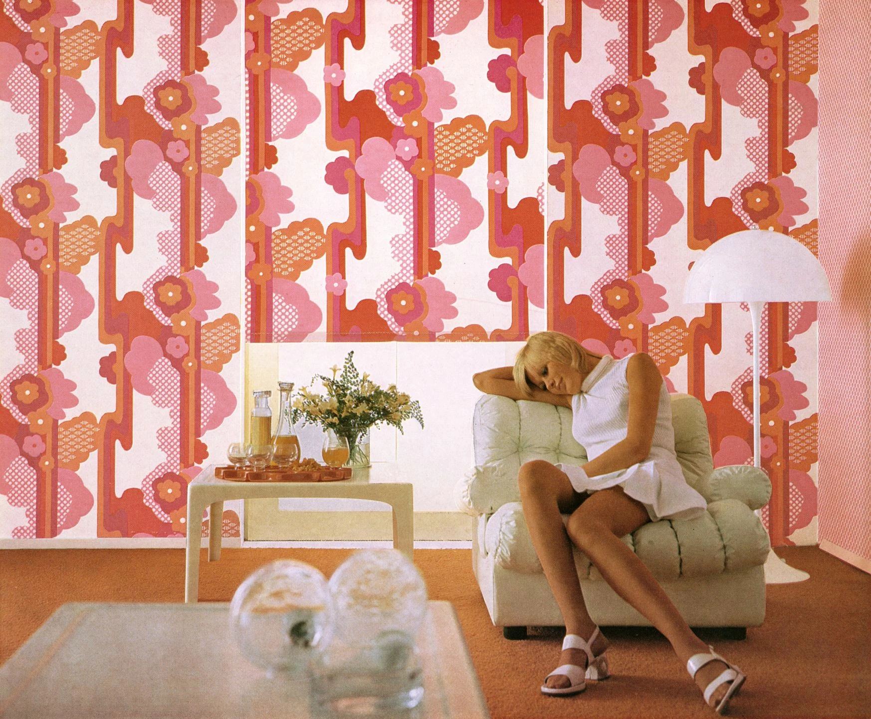 Direkt aus den 70ern stammt auch das abgebildete Original-Raumbild, auf dem sogar ein Vorhang im selben Design zu sehen ist. Wir jedoch konzentrieren uns ganz auf die Tapete und empfehlen Ihnen stattdessen Deko-Elemente in den Musterfarben oder der Grundfarbe Weiß, um die Wirkung von Avantgarde zu unterstreichen.