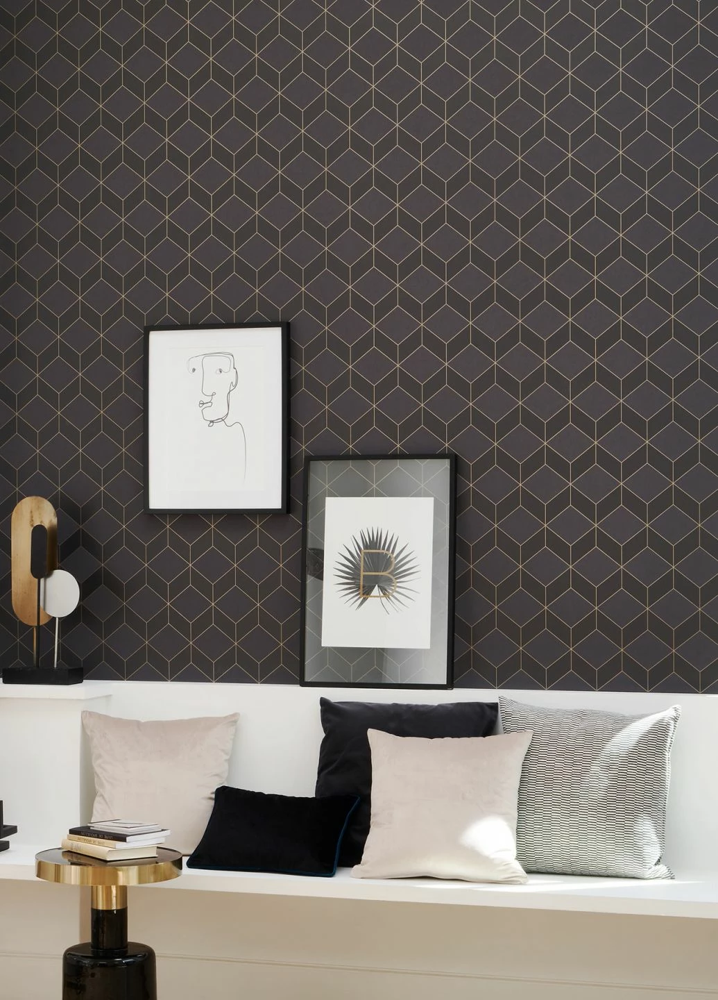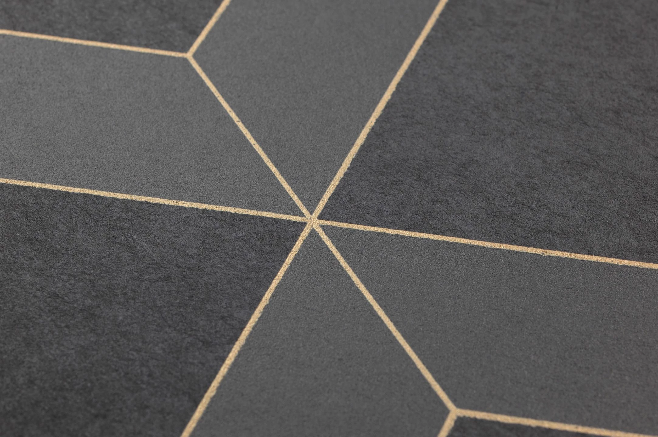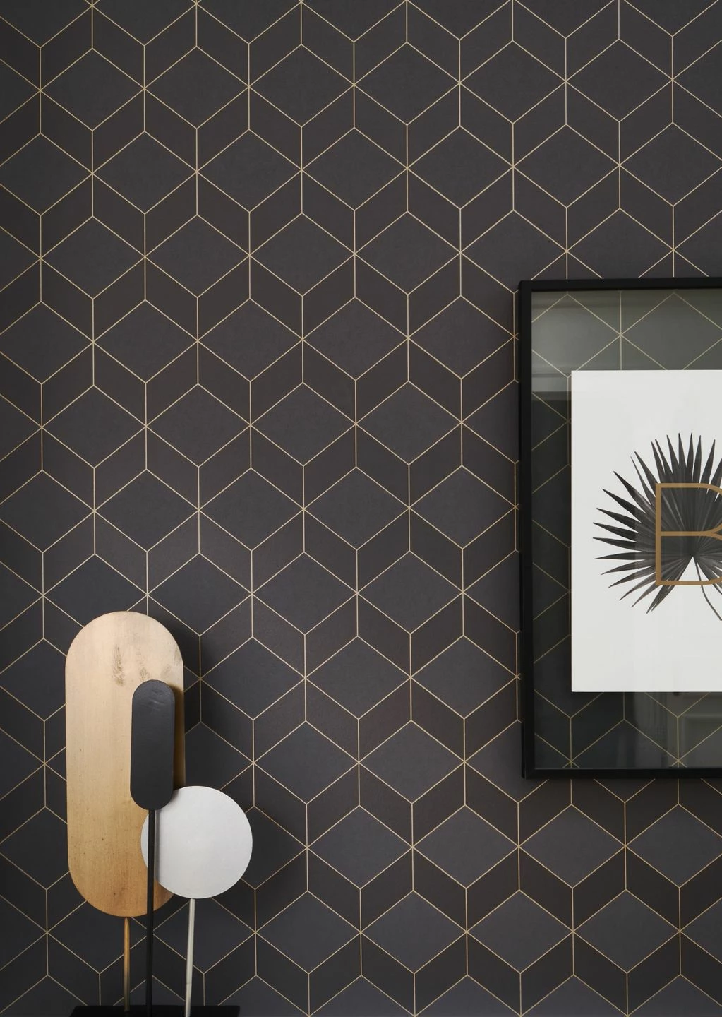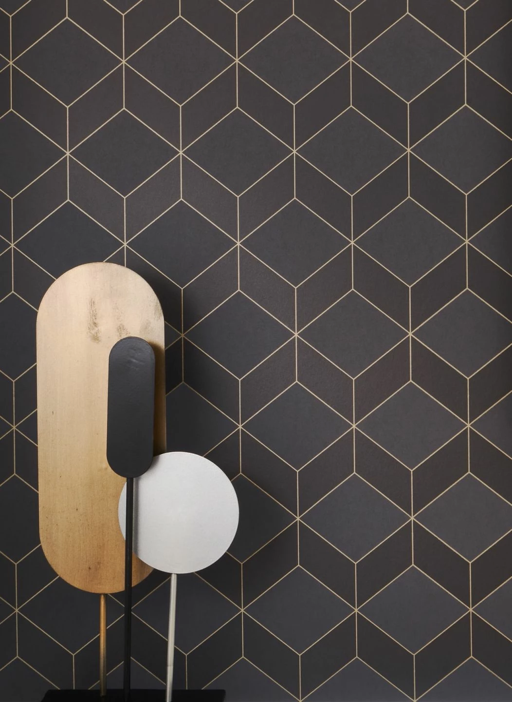 Warmes, dunkles Braun und sanft schimmerndes Anthrazit finden sich zu Rauten und Trapezen zusammen. Die ausgeklügelte Verteilung der Farben und die Umrisse in schimmerndem Beige lösen die ebene Fläche Ihrer Wand auf und lassen einen faszinierenden Effekt von räumlicher Tiefe entstehen. Die klaren Linien und geometrischen Figuren entstammen dem Art Deco. Creme- oder beigefarbene Möbel, entweder in der Formensprache der 20er und 30er Jahre oder in zeitlos klassischem Stil, bilden eine schöne Ergänzung.