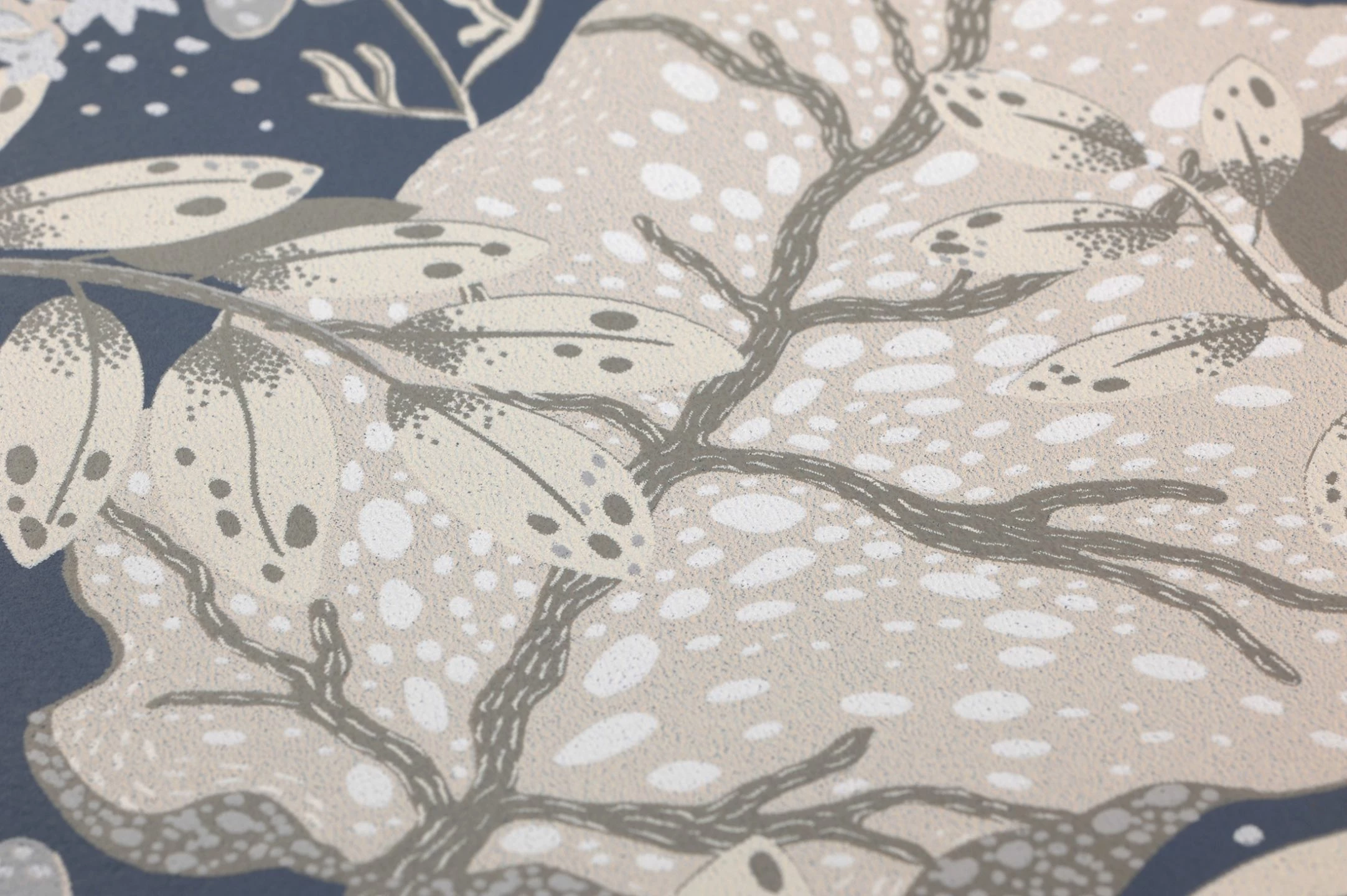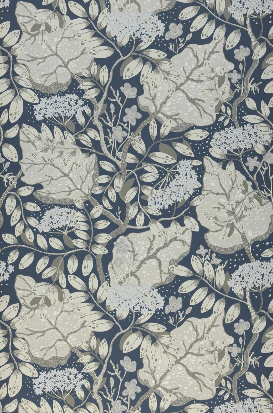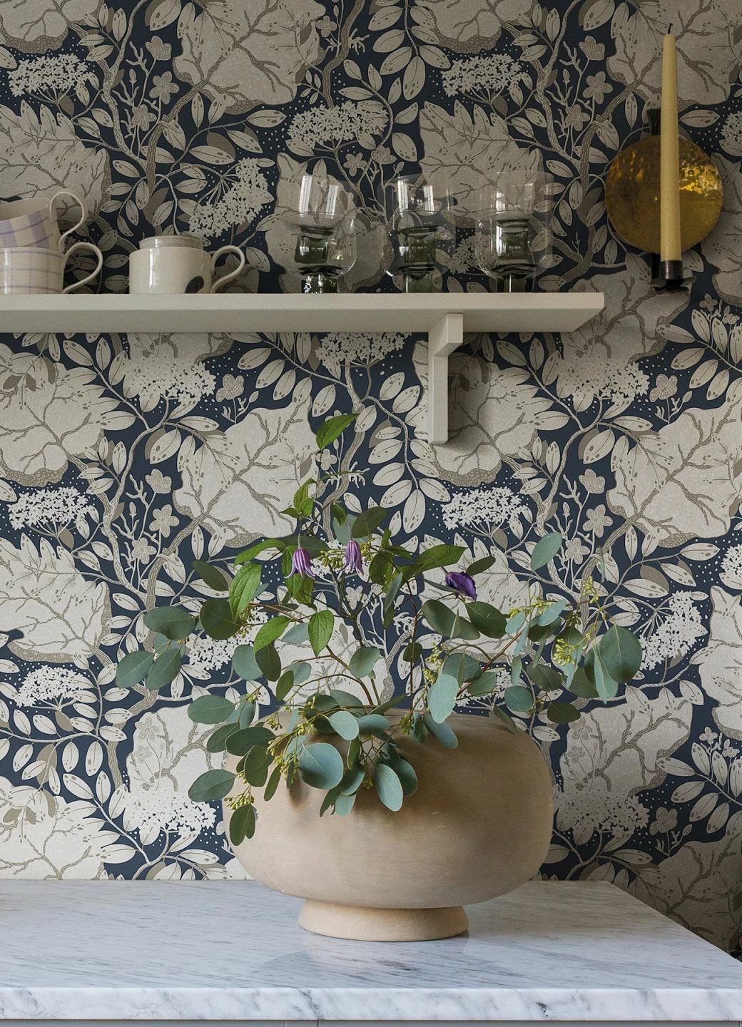 Große Blätter und zierliche Blüten prangen in Cremeweiß, Grautönen und Zartblau auf graublauem Grund. Durch Details in den verschiedenen Farbtönen erhalten die Blätter ein lebendiges Aussehen. Der dunkle Hintergrund steuert Ruhe zur üppigen Vegetation bei. Die blau-weiße Anmutung passt wunderbar in ein helles Schlafzimmer, ein Wohnzimmer oder auch in eine große Küche.