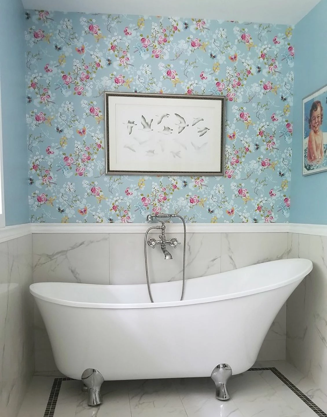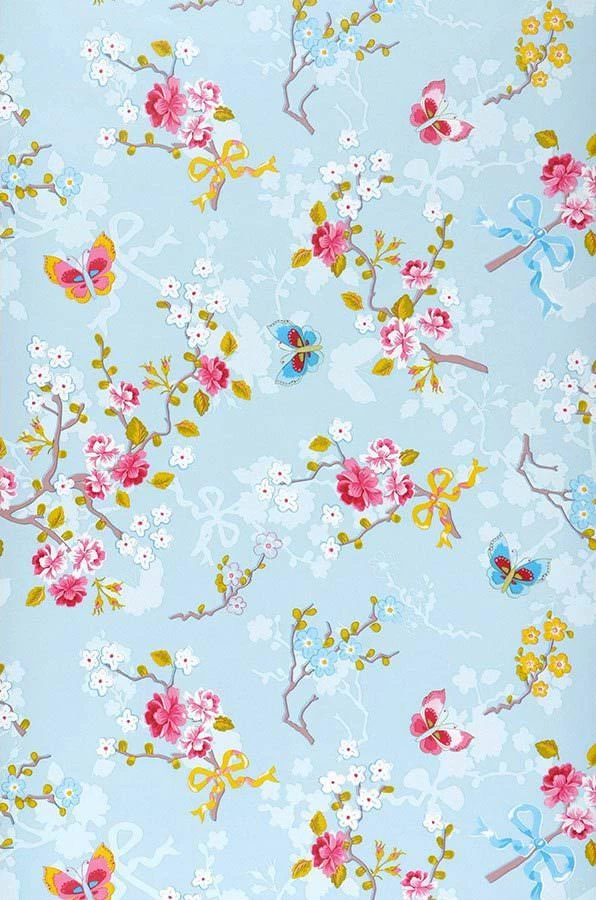 Schattierte Blütenzweige mit Schleifen und bunten Schmetterlingen auf blassblauem Grund verbreiten eine freundliche Stimmung, die jeden Raum zum gemütlichen Rückzugsort macht.
