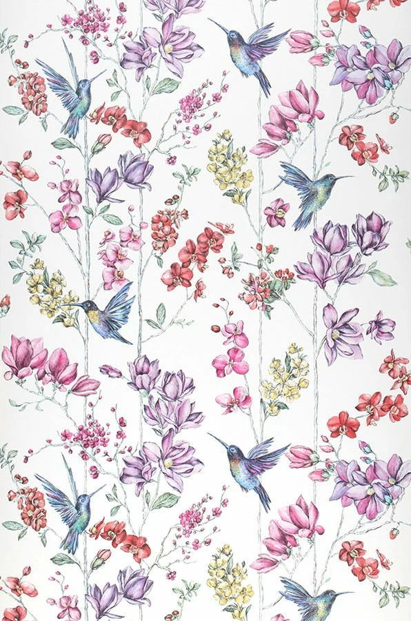 Exotische Kolibris in Paradiesfarben mit einer Blütenrankenpracht in Rot-, Violett, Magenta, Gelb und Grün setzen auf dieser weißgrundigen Variante der exklusiven Design Tapete Biala ein Understatement für Romantik mit Signalwirkung.