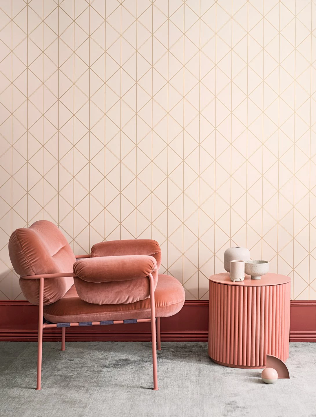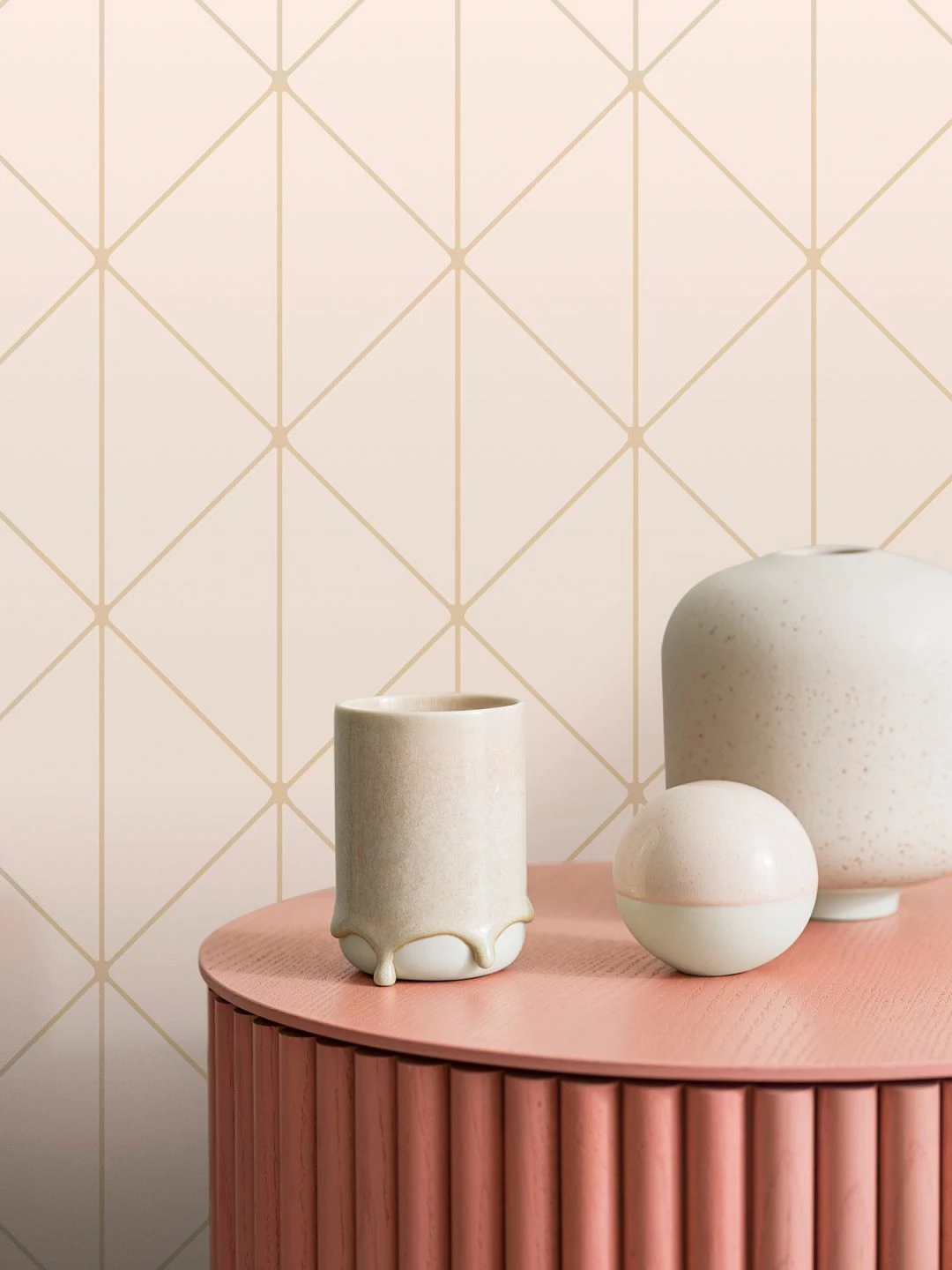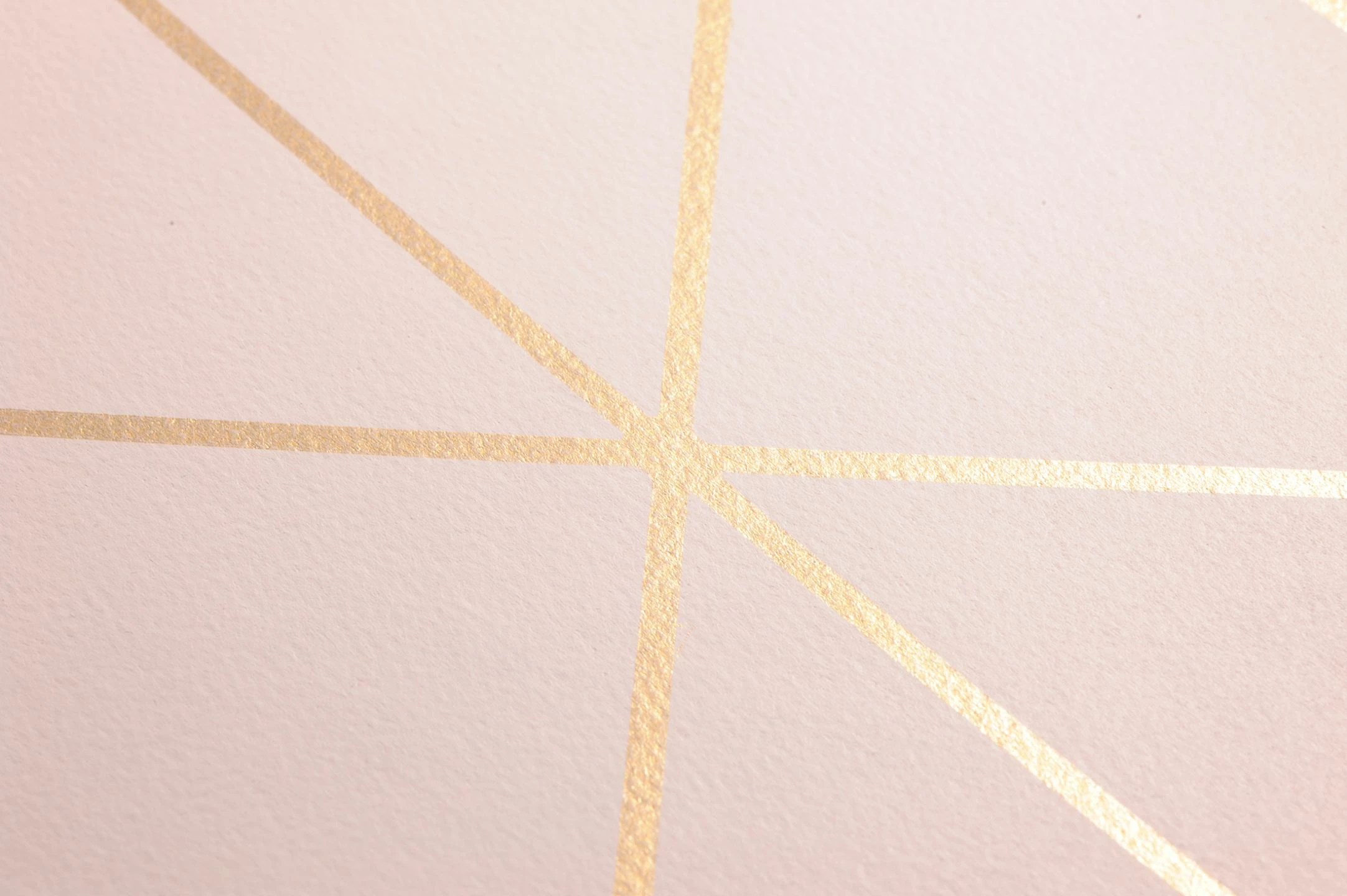 Feine Linien in schimmerndem Perlgold verlaufen senkrecht und diagonal über die zartrosa getönte Fläche der Tapete. Zusammen bilden sie ein elegantes, symmetrisches Muster im Art-Deco-Stil. Dreiecke, Karos und Parallelogramme entstehen aus dem Zusammenspiel der Linien und unterteilen die Fläche Ihrer Wand. Die Kombination aus Zartrosa und Gold wirkt dezent luxuriös und strahlt bei aller Sachlichkeit des Art Deco einen Hauch von Romantik aus.