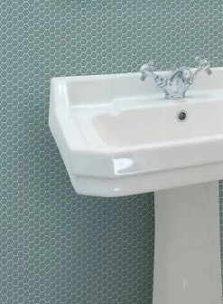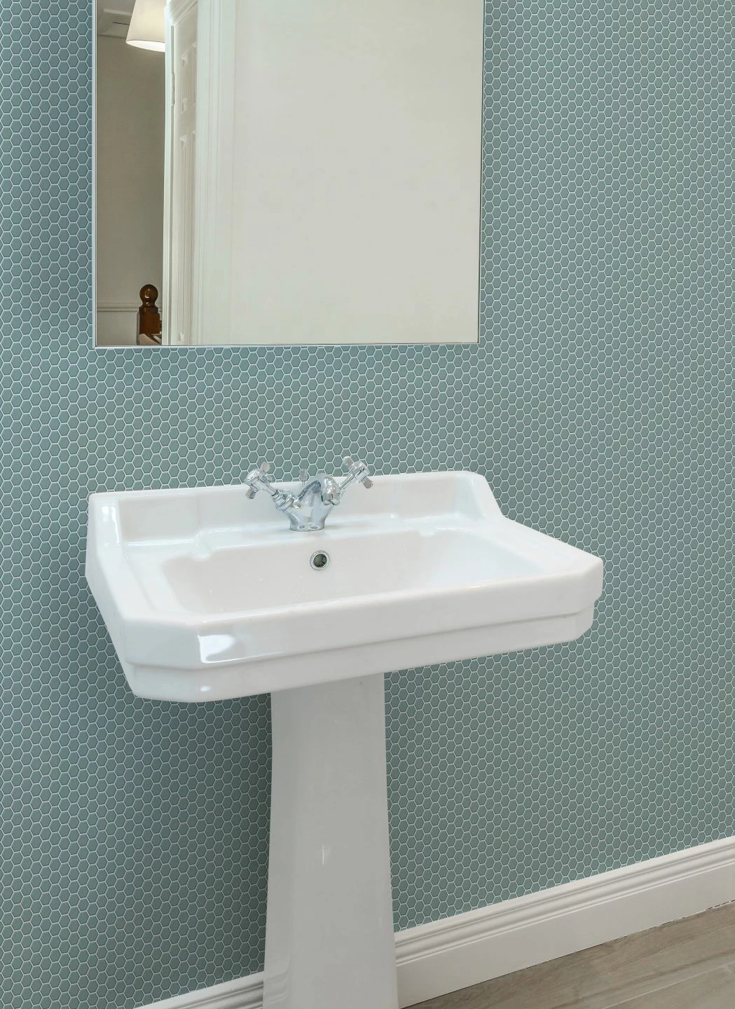 Wie kleine sechseckige Kacheln in hellem Pastelltürkis gestaltet das gleichmäßige geometrische Muster der Badezimmer-Tapete „Bogo“ Ihre Wände. Denn die weißen Fugen sind reliefartig in das Oberflächenmaterial eingeprägt. Das Vinyl der Tapetenoberfläche sorgt gleichzeitig dafür, dass „Bogo“ hoch waschbeständig ist und sich damit bestens für die Ausstattung eines attraktiven, hellen Badezimmers eignet.