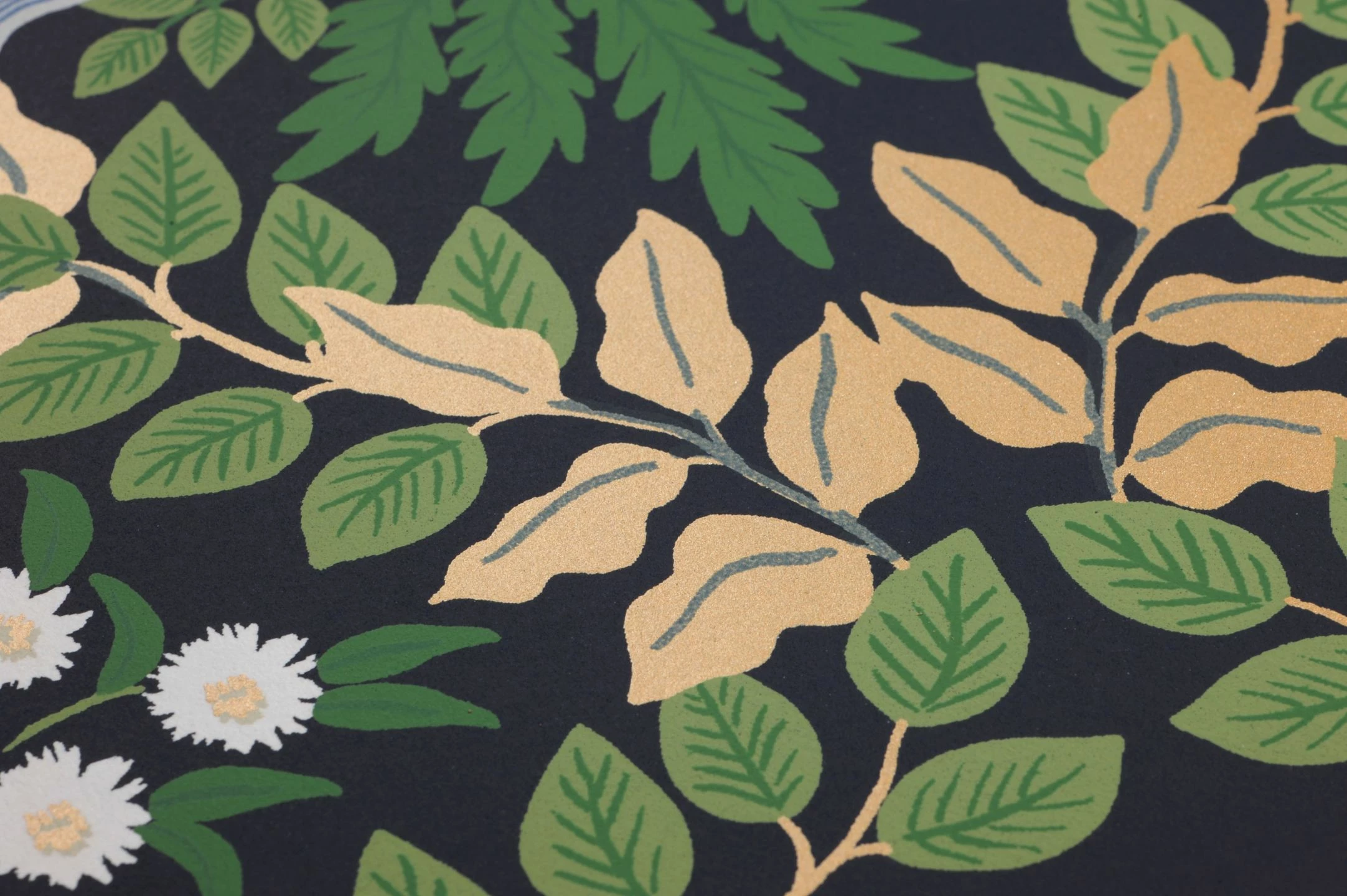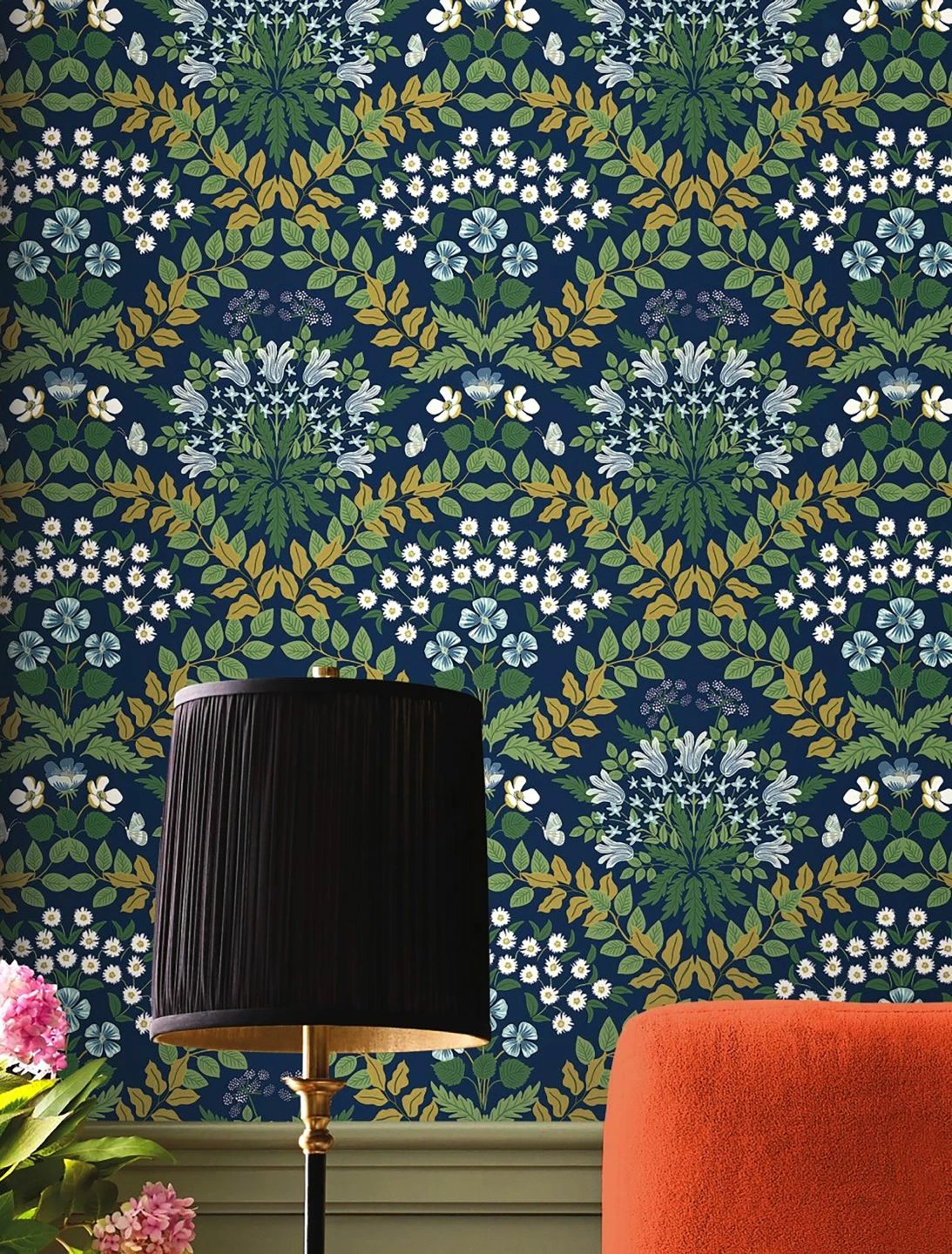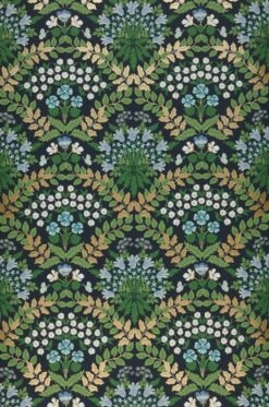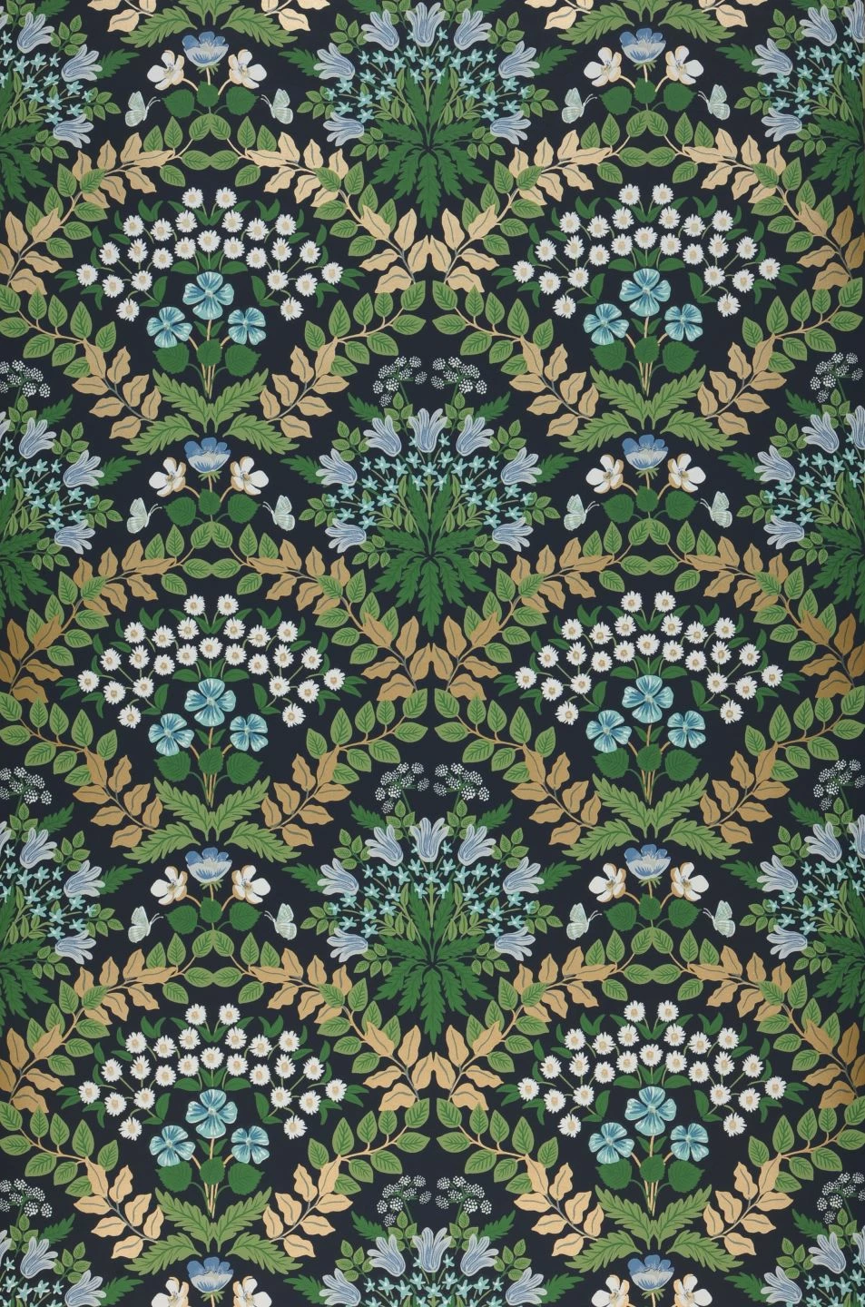 Gänseblümchen, Glockenblumen und Vergissmeinnicht in zauberhaften Arrangements, dazwischen Schmetterlinge, leuchten vom dunkel stahlblauen Grund in frischen Blautönen und Weiß. Umrahmt werden die zierlichen Blüten durch Blattranken in Grüntönen und Mattgold. Die Frische und Leichtigkeit des skandinavischen Stils verschmilzt auf der Vliestapete aus dem Hause Rifle Paper mit der Anordnung eines klassischen Tapetenmusters zu einer außergewöhnlichen Synthese.