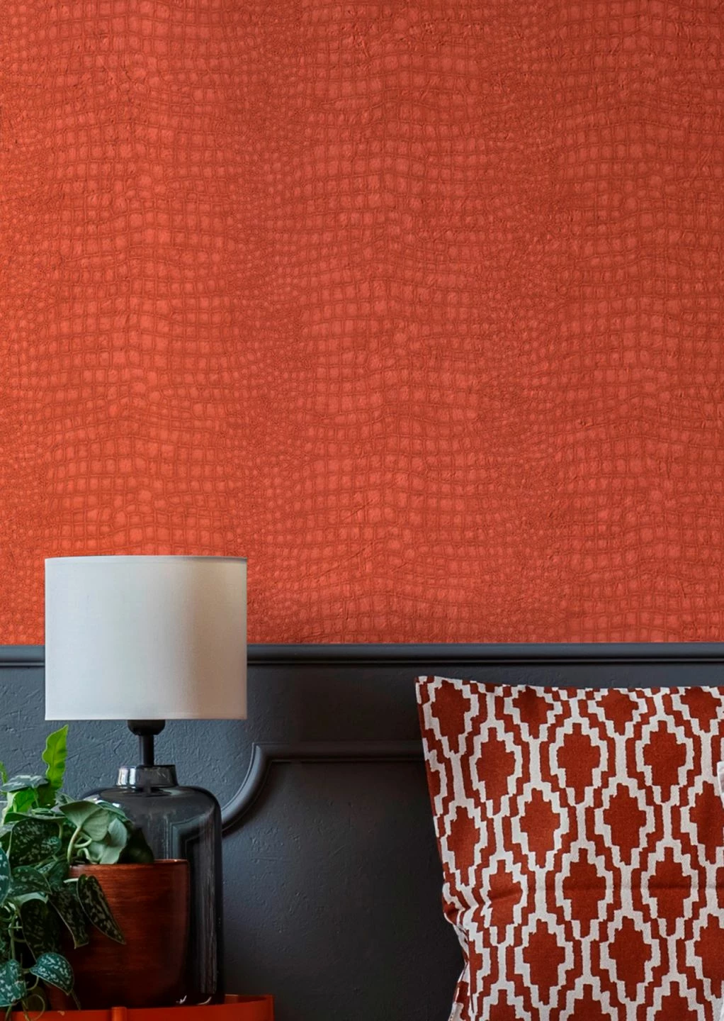 Das leuchtende, feurige Lachsorange in Verbindung mit der typischen Optik von Krokodilleder-Imitation bildet eine lebendige, anregende Kulisse für Ihren Raum. In Verbindung mit dunklem Holz ergibt sich ein wunderschöner Kontrast. Das Narbenmuster ist als fühlbares Relief in die Vinyloberfläche geprägt. Die Vliestapete ist hoch waschbeständig und daher auch für Ihr Badezimmer bestens geeignet.
