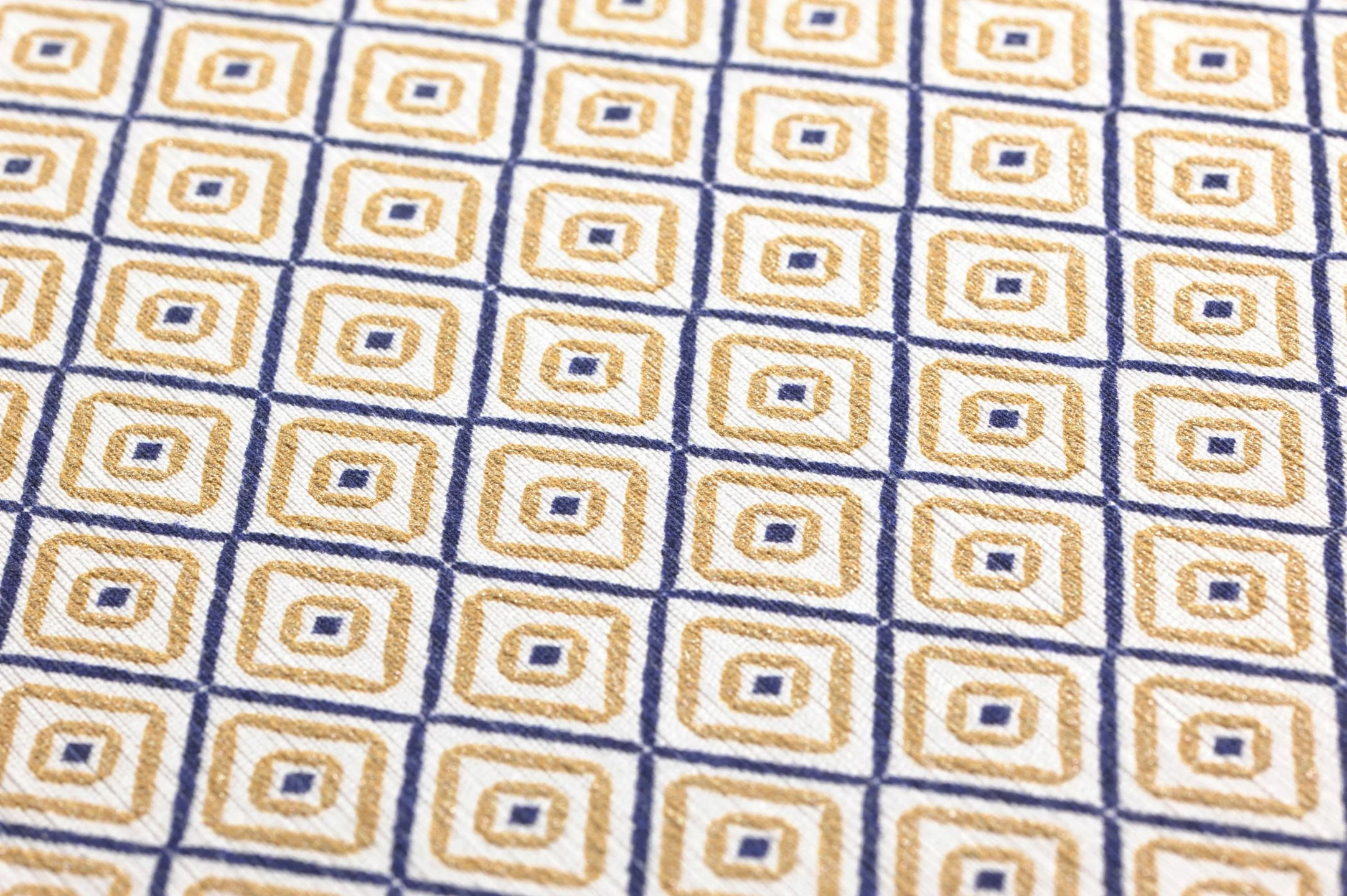Eine Textiltapete voller Schick ist Calaluna mit ihren edlen Kettfäden, die wie ein feines Relief spürbar sind und den Gewebecharakter betonen. Aus dunkelblauen und weißen Fäden entsteht ein Muster von gleichmäßig angeordneten Rauten. Mattgoldene Fäden heben das Muster hervor und sorgen für einen sanften Schimmer in Ihren vier Wänden. Calaluna verbindet die Wärme und Stabilität des Textilmaterials mit einem Hauch von luxuriöser Eleganz.