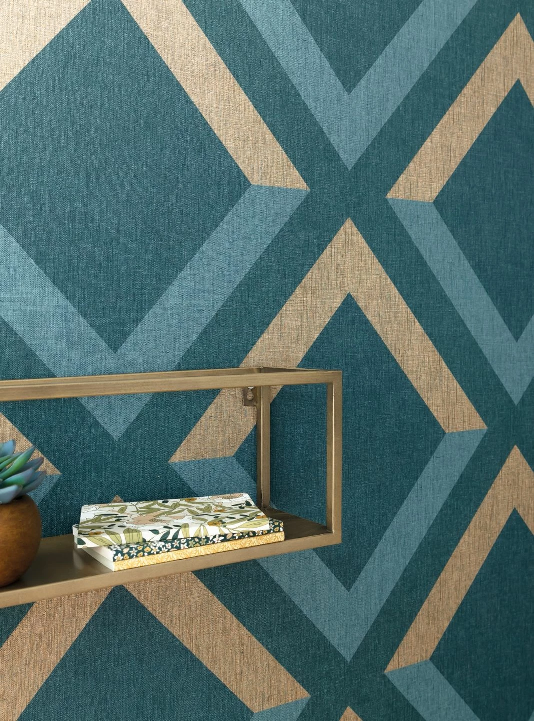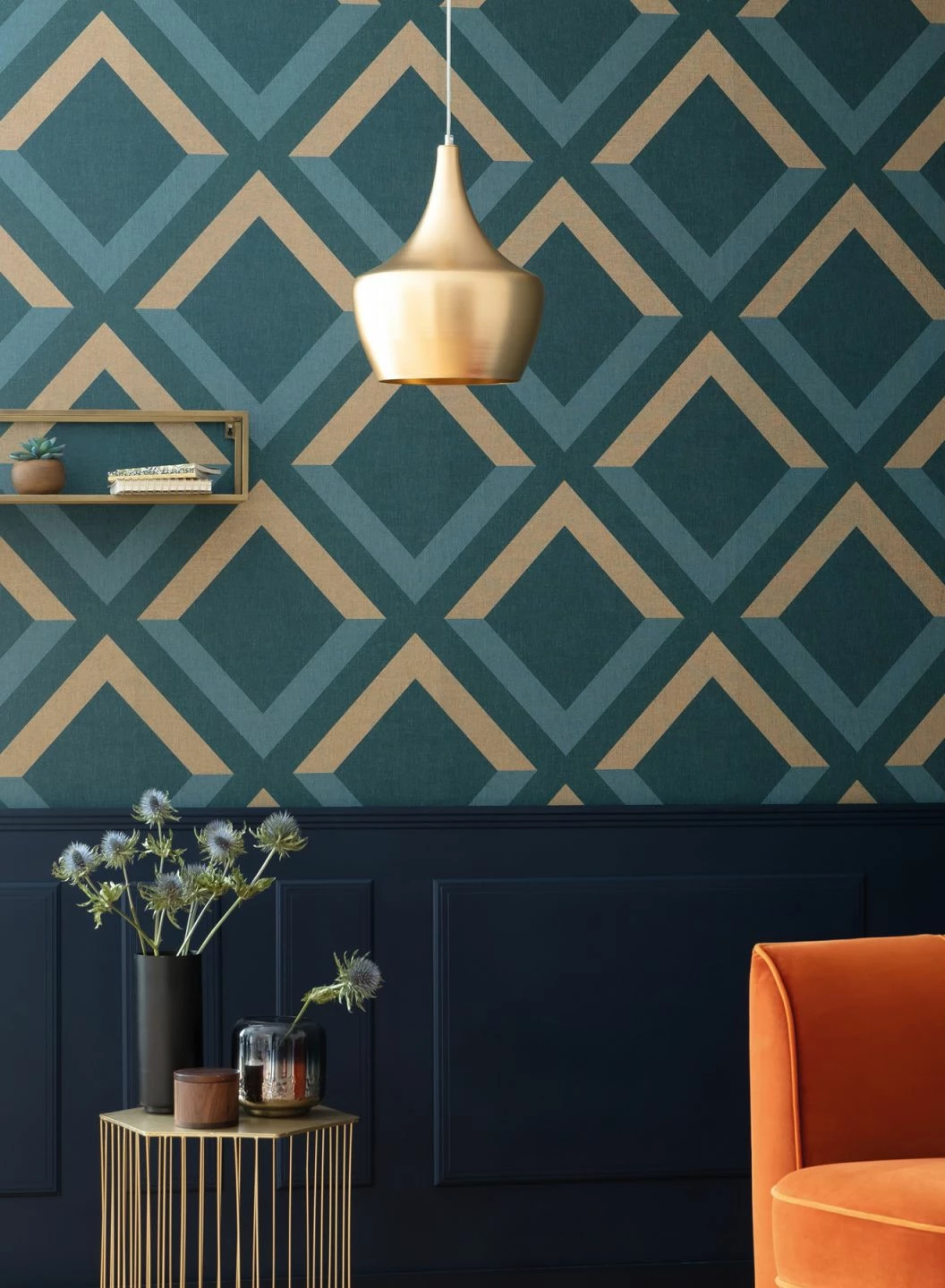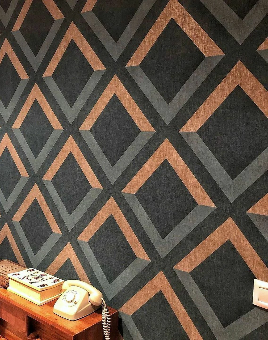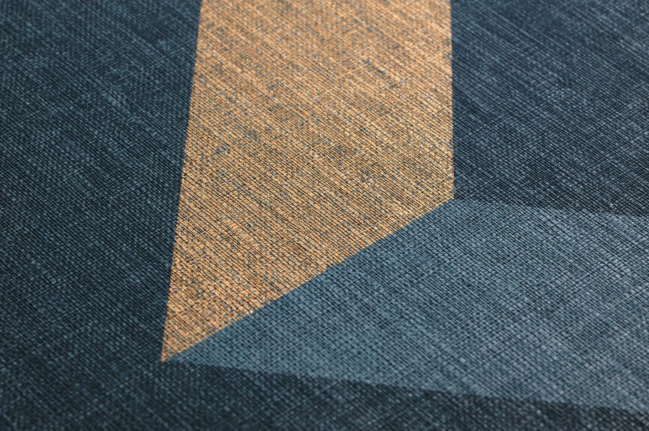 Durch die zweifarbige Gestaltung der Rauten entsteht ein wahrhaft doppeldeutiges Muster. So lassen sich offene Dreiecke entdecken, welche durch die textile Struktur der Vinyloberfläche besonders raffiniert wirken. Das gute Tapetenstück lässt den Art Deco Stil in modernem Maße wieder aufleben.