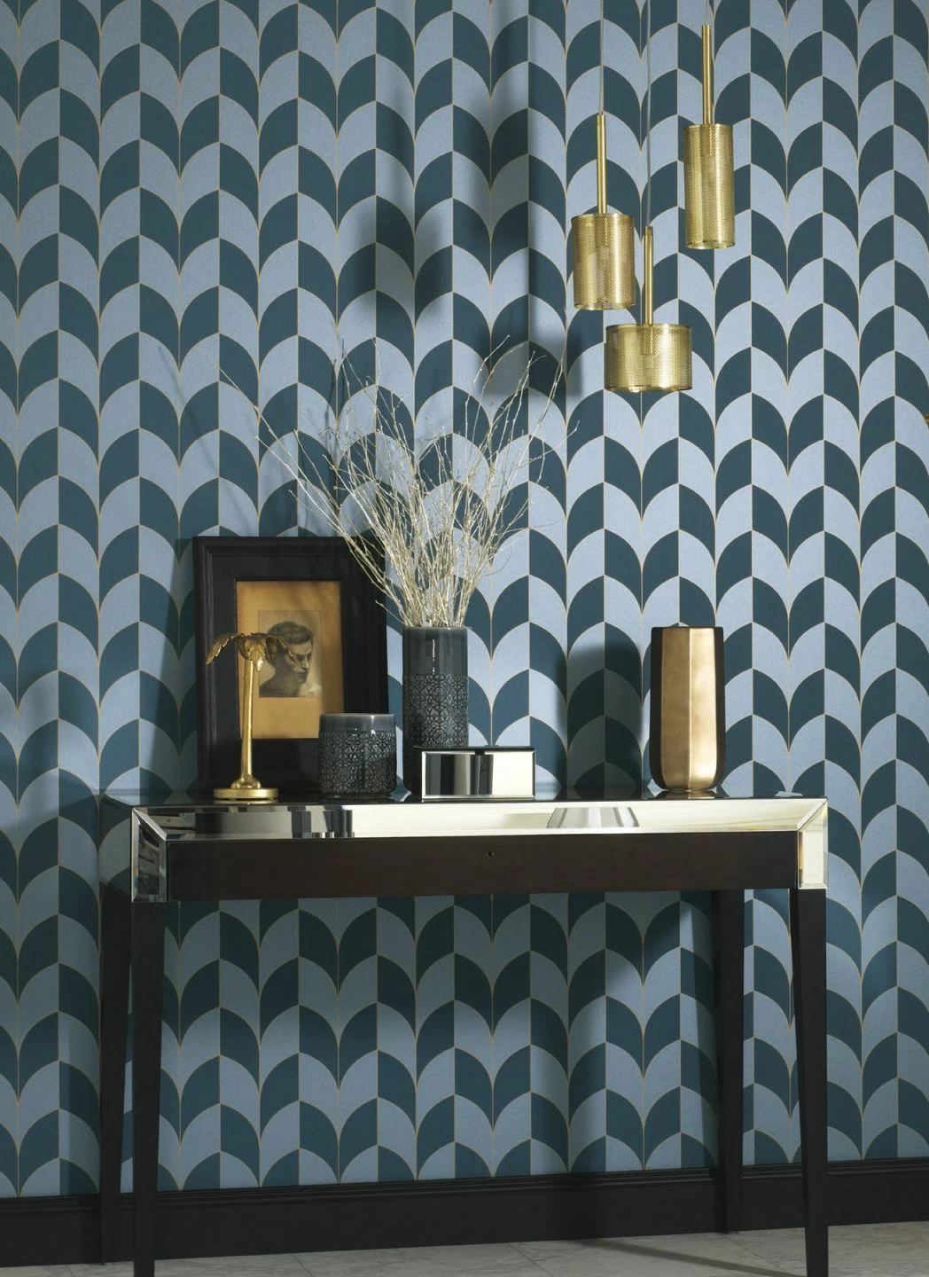 Die künstlerische Freiheit des Art Deco spiegelt sich in Designtapete Caprice im dynamischen Mustermix wieder. Halbbögen und Streifen zaubern fließende Bewegung in den Raum. Die erlesene Farbkomposition in Grünblau wird mit Goldgelb für einen glamourösen Look verfeinert.