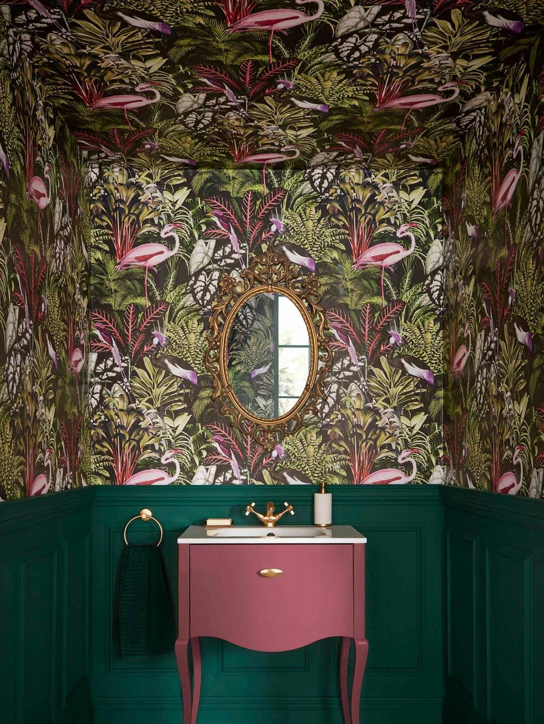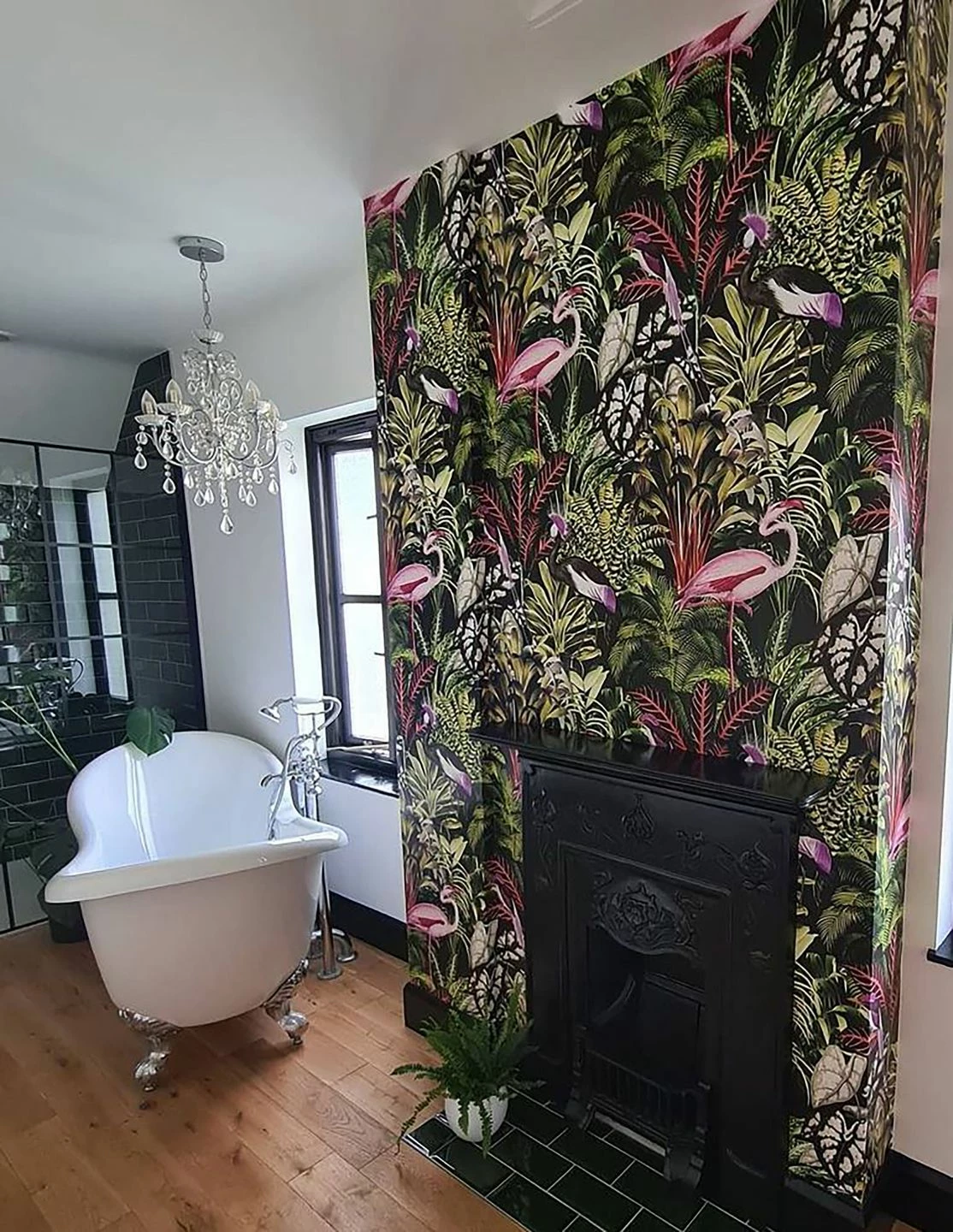 Tropische Pflanzen mit schön geformten Blättern in Hülle und Fülle zaubern einen exotischen Garten an Ihre Wände. Inmitten der verschiedensten Blattpflanzen finden sich Flamingos, Kronenkraniche und Paradiesvögel mit bunt leuchtendem Gefieder. In einem Raum, der mit diesem ausdrucksstarken Wandschmuck in kräftigen Grün-, Rosa- und Rottönen auf dunklem Grund ausgestattet ist, fällt es leicht, sich aus dem Alltag in ein karibisches Paradies zu träumen.