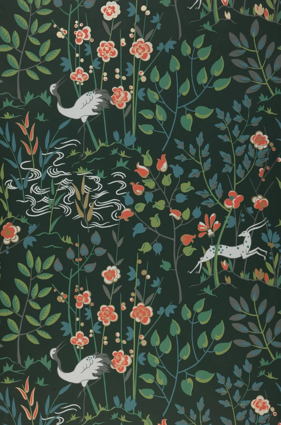Zwischen Sträuchern und in voller Blüte stehenden Blumen kräuseln sich stilisierte Wellen zu einer angedeuteten Uferlandschaft. Kraniche und Antilopen versetzen Sie in eine exotische Welt im fernen Osten. Inmitten der vorherrschenden Blau- und Grüntöne setzen die Blüten mit ihrem leuchtenden Orientrot und den Details in schimmerndem Perlgold und hellem Grauweiß freundliche, farbenfrohe Akzente.