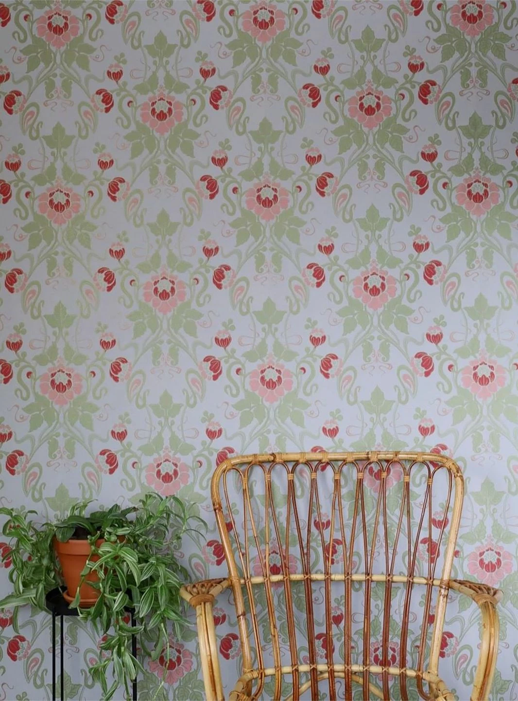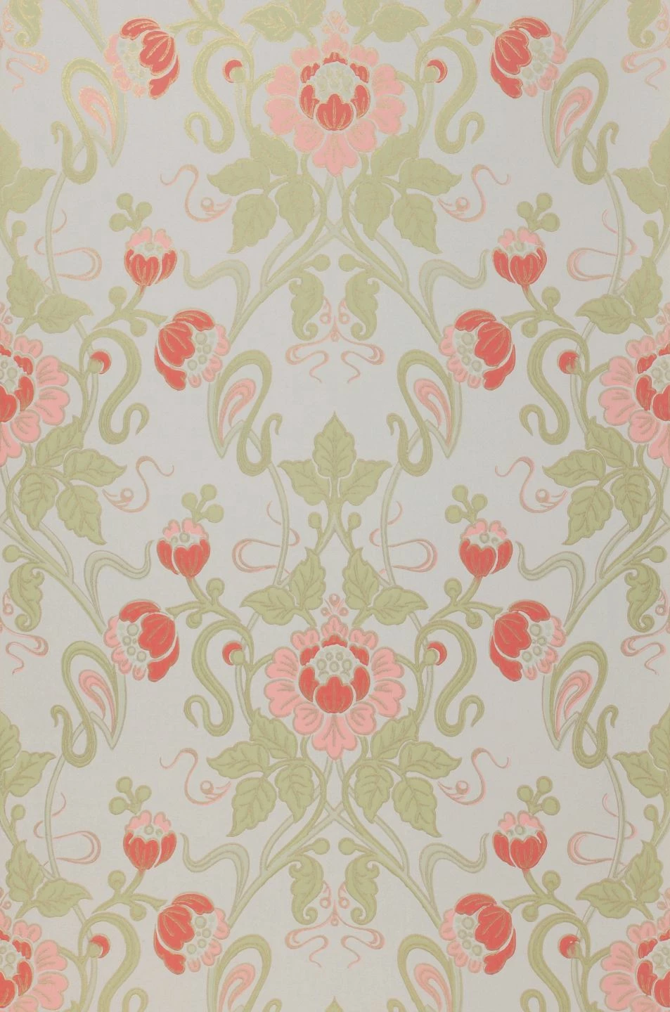 Besonders kunstvoll schlingen sich die lichtgrünen Blattranken auf dem hellen grauen Grund um die stilisierten und symmetrisch angeordneten Blüten in Rot und Altrosa. Akzente in schimmerndem Gold betonen die warmen Farbtöne auf dem grauen Untergrund. Diese luxuriöse Jugendstil-Papiertapete ist im traditionellen Leimdruckverfahren gefertigt und verströmt dadurch den unverkennbaren Charakter des Handgemachten.