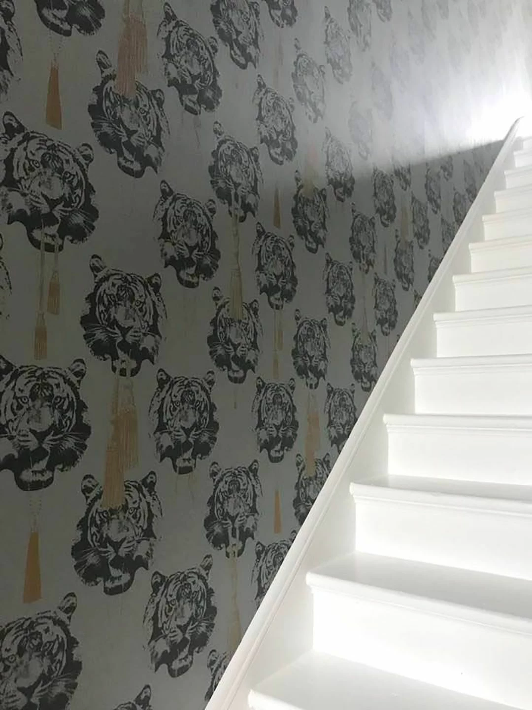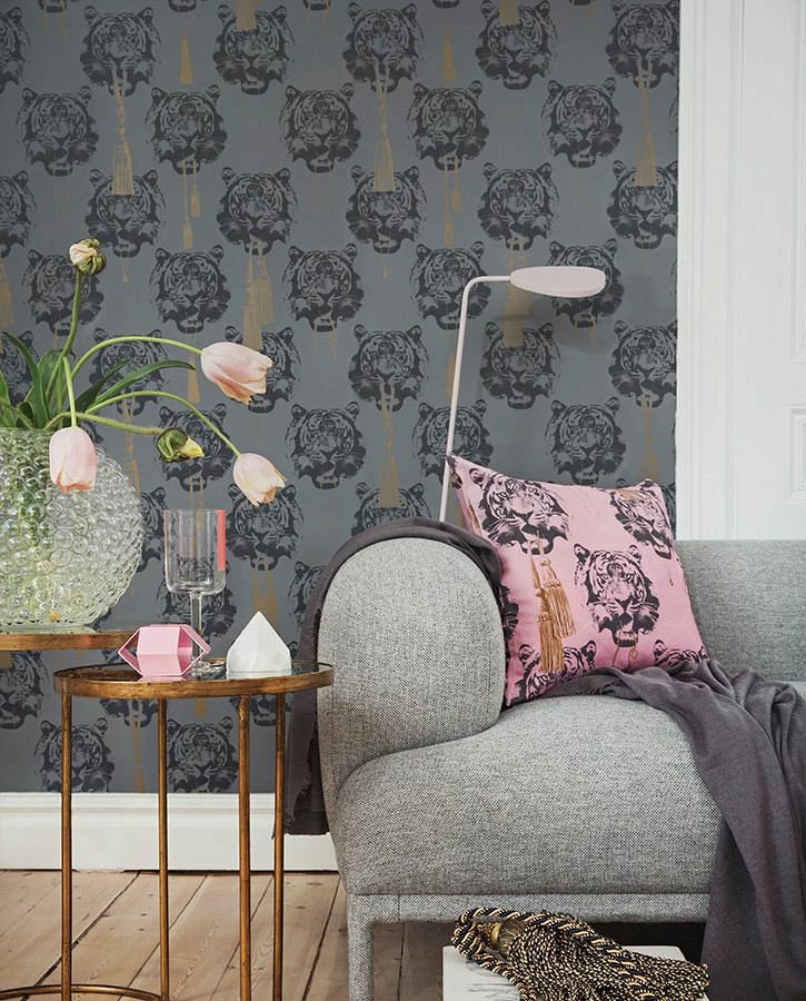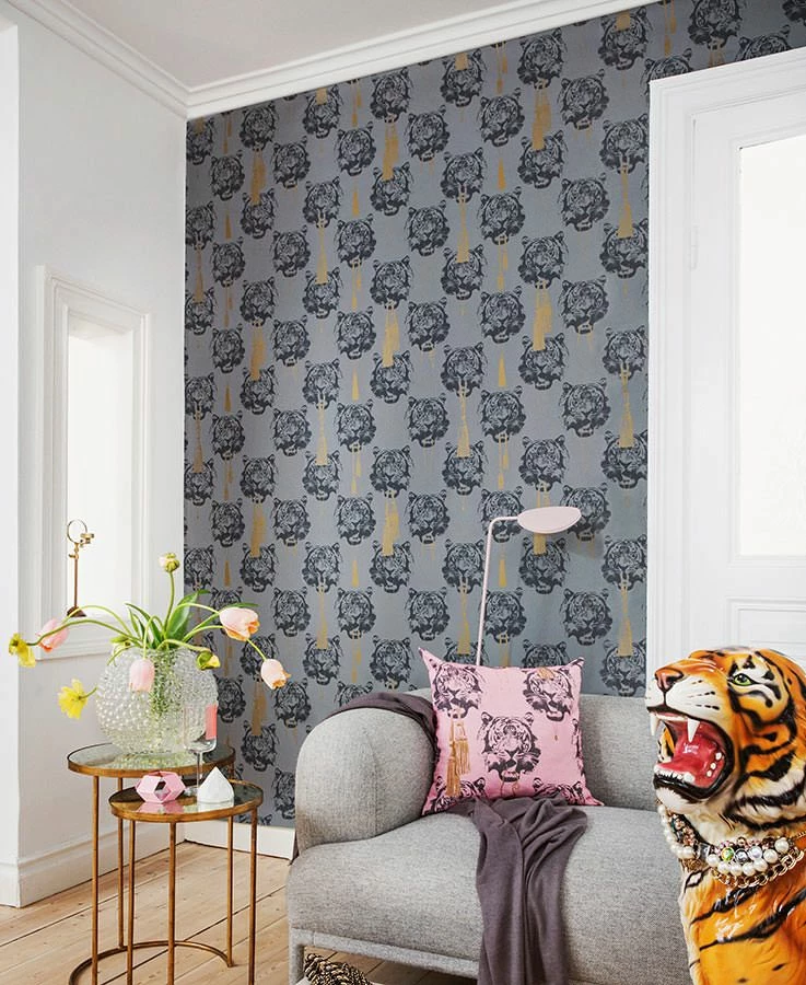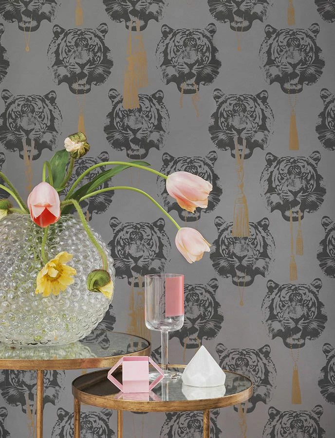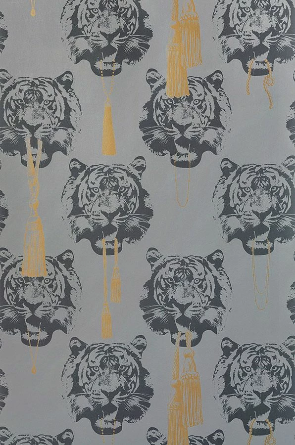 Luxuriöser Schmuck und pompöse Zierquasten aus dem Mund des wilden Tigers. Die Designer Tapete vereint afrikanische und orientalische Aspekte zu einer hochmodernen Komposition, die Räume mit anteiligen Stilkomponenten in ein elegantes Ambiente taucht. Hier kommt das besondere Faible der Tapetenkünstlerin Lisa Bengtsson für Figuren und Formen raffiniert zum Ausdruck.