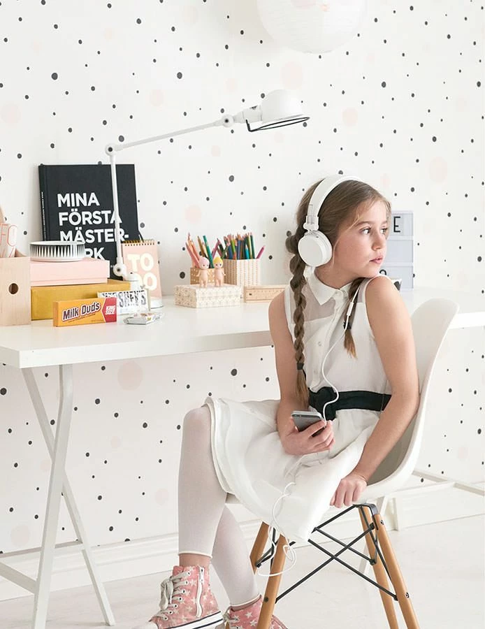 Extravagant zeigen sich die unterschiedlich großen Polka Dots in Anthrazitgrau und Blassbeige auf dem cremeweissen Tapetenuntergrund. Die Kindertapete von Majvillan hat eine sehr selbstbewusste Ader und ist genau die richtige Wandgestaltung für kleine und große Mädchen, die wissen, was sie wollen.
