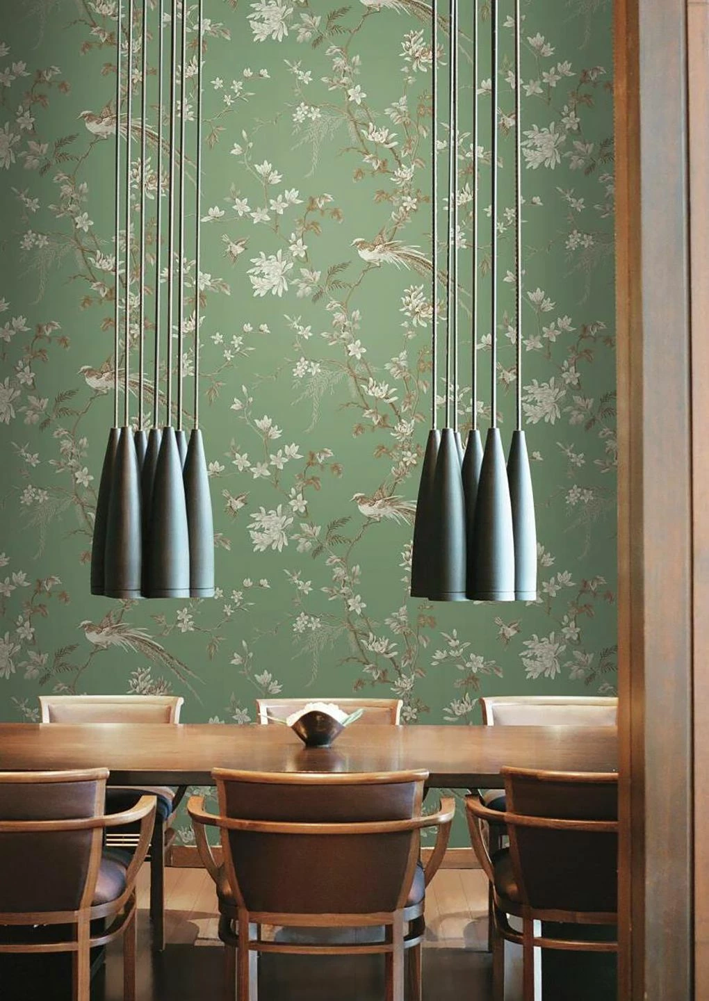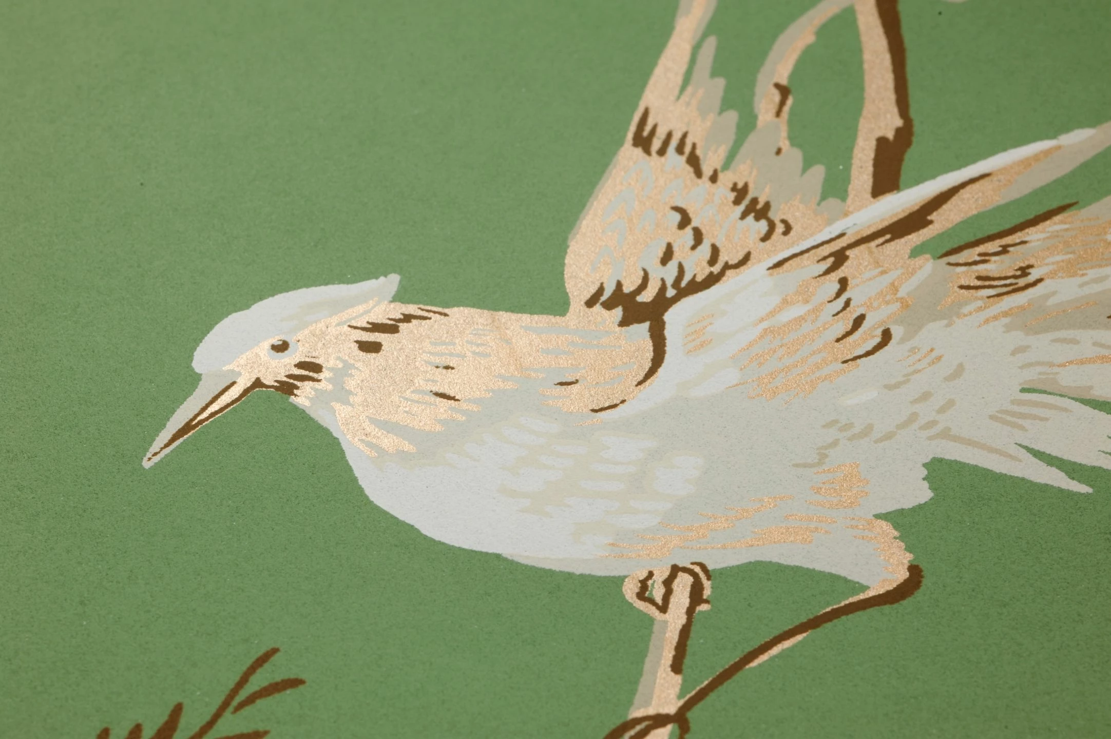 Große Vögel mit prachtvollen Federn, zarte Zweige mit filigranen Blüten und Blättern verbreiten orientalisches Flair. Die Farbkombination aus dem grünen Grund und den dezenten Grau- und Brauntönen, Weiß und Perlgold im Muster wirkt zurückhaltend und kostbar zugleich. Diesen Eindruck verstärkt die angewandte Leimdrucktechnik, die Vliestapete Coringa eine hochwertige, handgearbeitete Anmutung verleiht.