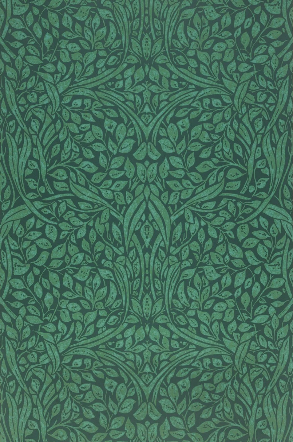 Blätter verschiedener Art und Größe verschmelzen nach Art des Jugendstils zu einem dichten Lianen Dschungel. Farn- und Kieferngrün wirken authentisch. Die glatte Vliestapete in Leimdruckoptik, mit abwaschbarer Oberfläche, heißt Gäste willkommen oder verwandelt Wohn- und Aufenthaltsräume in grüne Oasen.