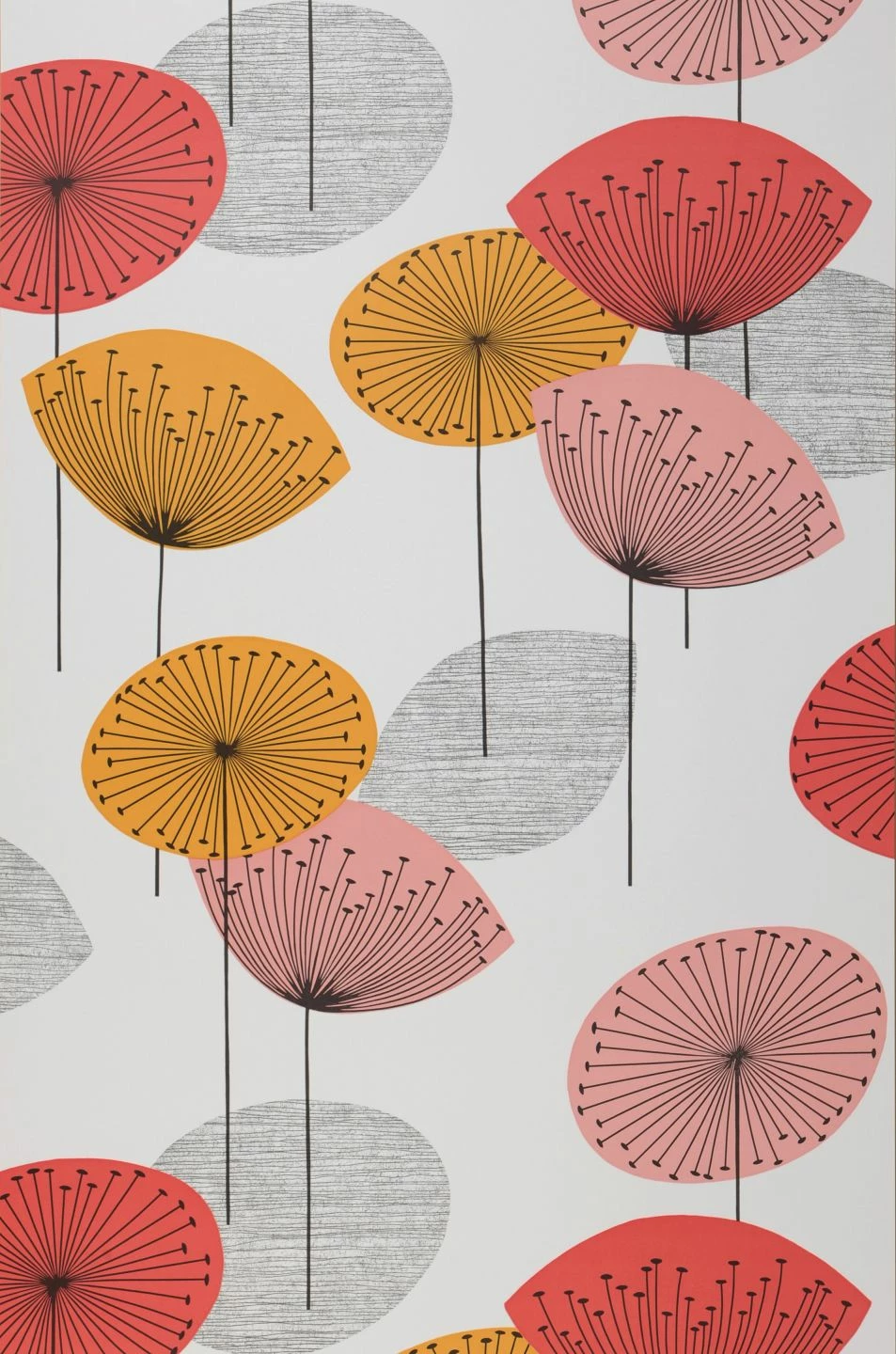 In sattem Maisgelb, hellem Rot und Rosa leuchten die stilisierten Pusteblumen auf dem weißen Grund. Ihre duftigen Kugeln an den feinen Stängeln werfen zarte Schatten. Die Vintage-Tapete verbreitet gute Laune im Stil der 70er Jahre und ist mit ihren fröhlichen Farben ein echter Hingucker. Möbel mit der ausgeprägten Formensprache dieser Zeit passen prächtig zu der ausdrucksstarken Wanddekoration.