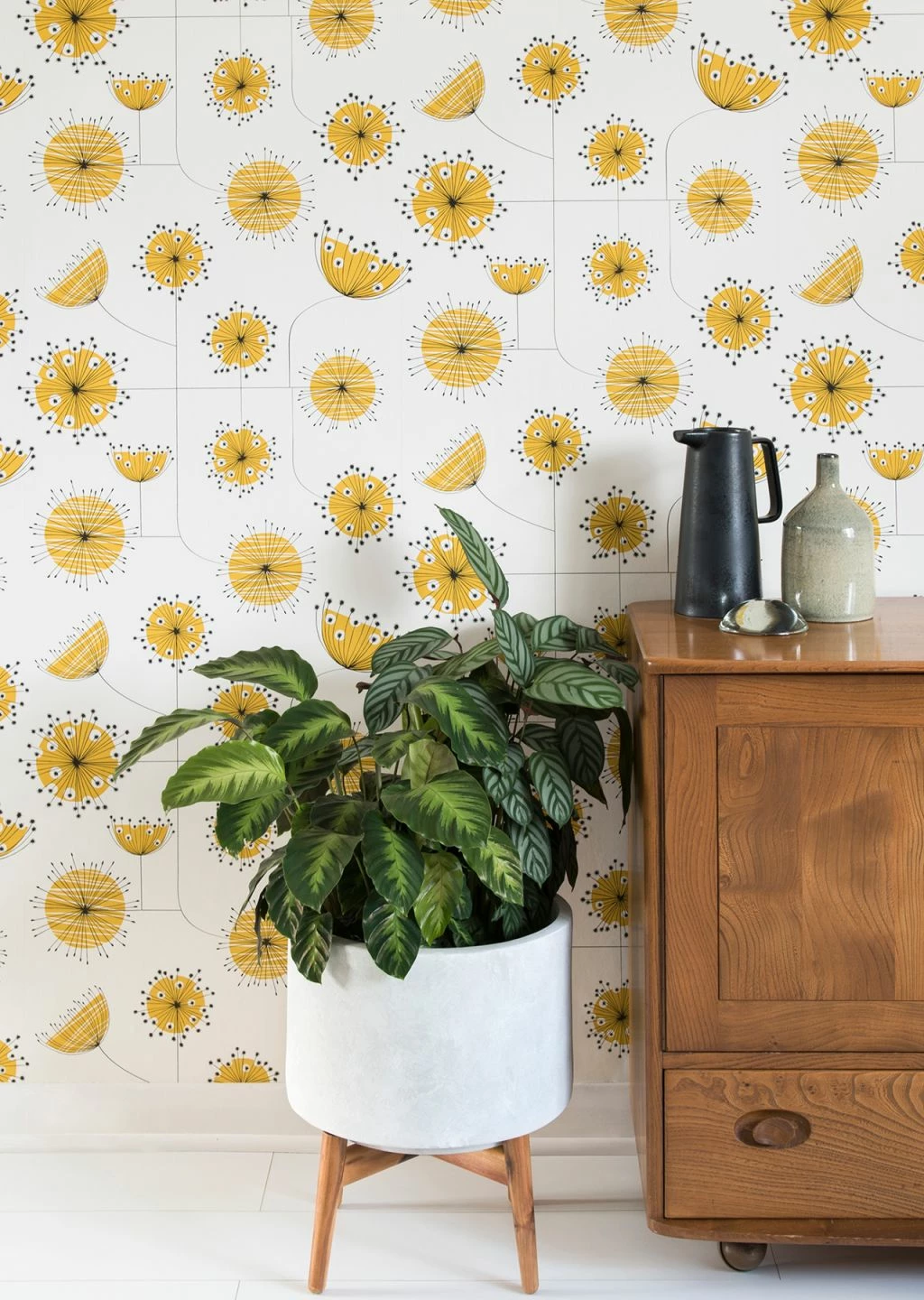 Gelbe Kreise und Halbkreise, Schraffuren in Weiß und schwarze Linien bilden stilisierte Blumen und schlagen eine Brücke zwischen dem leuchtenden Gelb, mit dem die Blüten des Löwenzahns im Frühling die Wiesen übersäen, und den federleichten Samen, die die Pusteblume in alle Windrichtungen schickt. Die helle, fröhliche Vliestapete verbreitet sonnige Frühlingsstimmung und ist an Ihren Wänden ein echter Hingucker.