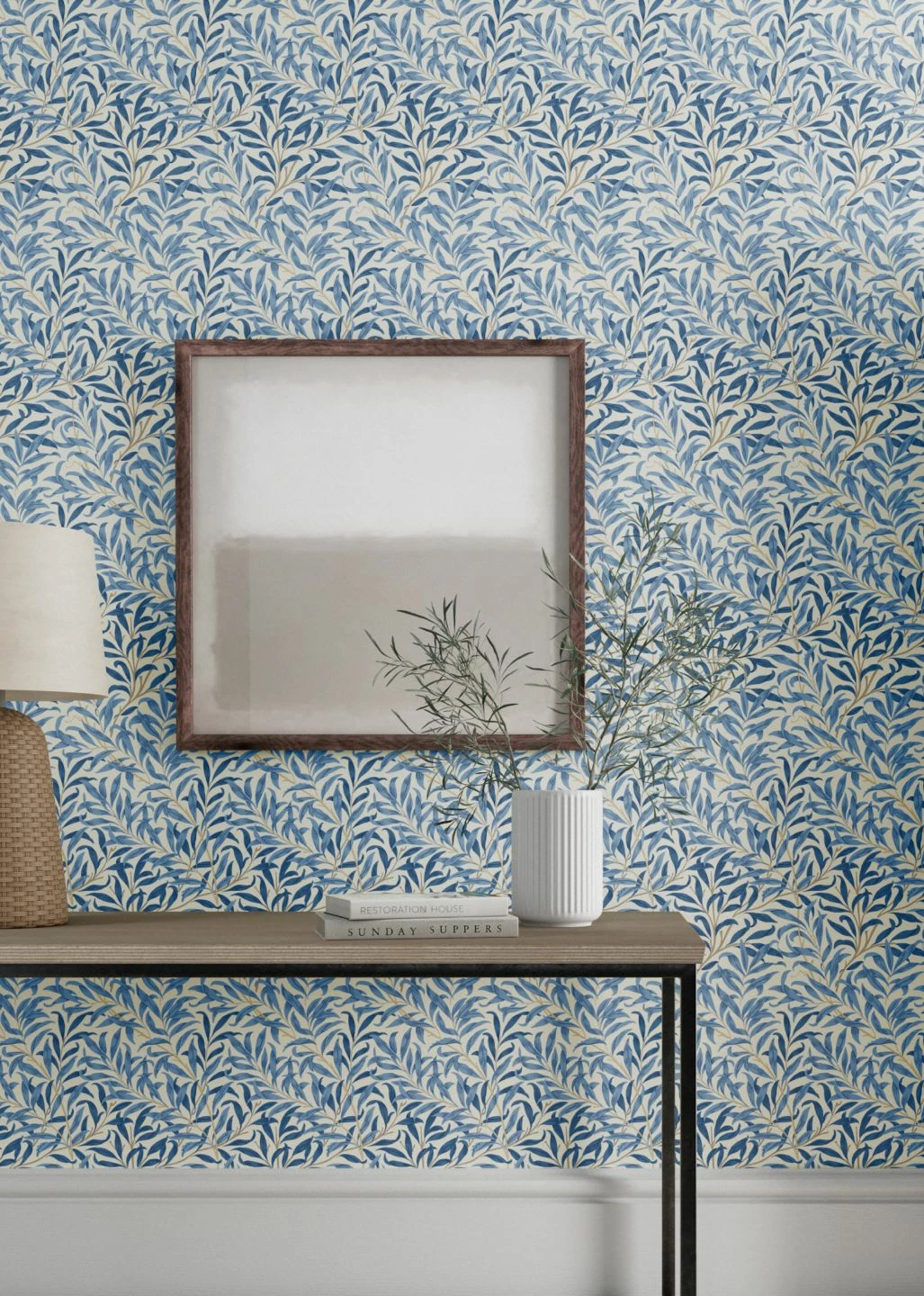 Die schlanken Blätter der Weide bilden hier ein schützendes Dickicht. Abstufungen von hellem Blau auf dem weißen Grund ergeben einen Eindruck von Frische und angenehmer Kühle. Doch der besondere Zauber dieses Tapetenmusters steckt im Detail: Durch Linien und Schraffuren in einem dunkleren Blauton, die die Formen der Blätter betonen, wirken diese besonders naturgetreu, so als würde eine sanfte Brise sie bewegen.