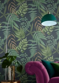 Fein verästelte Farnblätter in ihrer ganzen Formenvielfalt erzeugen eine Atmosphäre von Ruhe und Geborgenheit. Die verschiedenen Nuancen von Grün entfalten auf dem graublauen Hintergrund der Vliestapete ihre Leuchtkraft, die von Details in Erikaviolett noch betont wird. In Verbindung mit Möbeln aus naturbelassenem Holz steht die Natur ganz im Mittelpunkt. Oder Sie greifen eine der Musterfarben auf und schaffen so eine ästhetische Einheit.