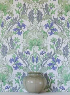 Die typischen stilisierten Blüten und filigranen Blattranken des Jugendstils bestimmen das Bild dieser exklusiven Papiertapete, die im Leimdruckverfahren hergestellt wurde. Auf dem cremeweißen Grund sorgen die zarten Grau- und Grüntöne der Blätter und das Violettblau der Blüten für zeitlose Leichtigkeit inmitten des nostalgischen Designs. Sie kreieren ein stilvolles, anheimelndes Ambiente im Retro-Schick.