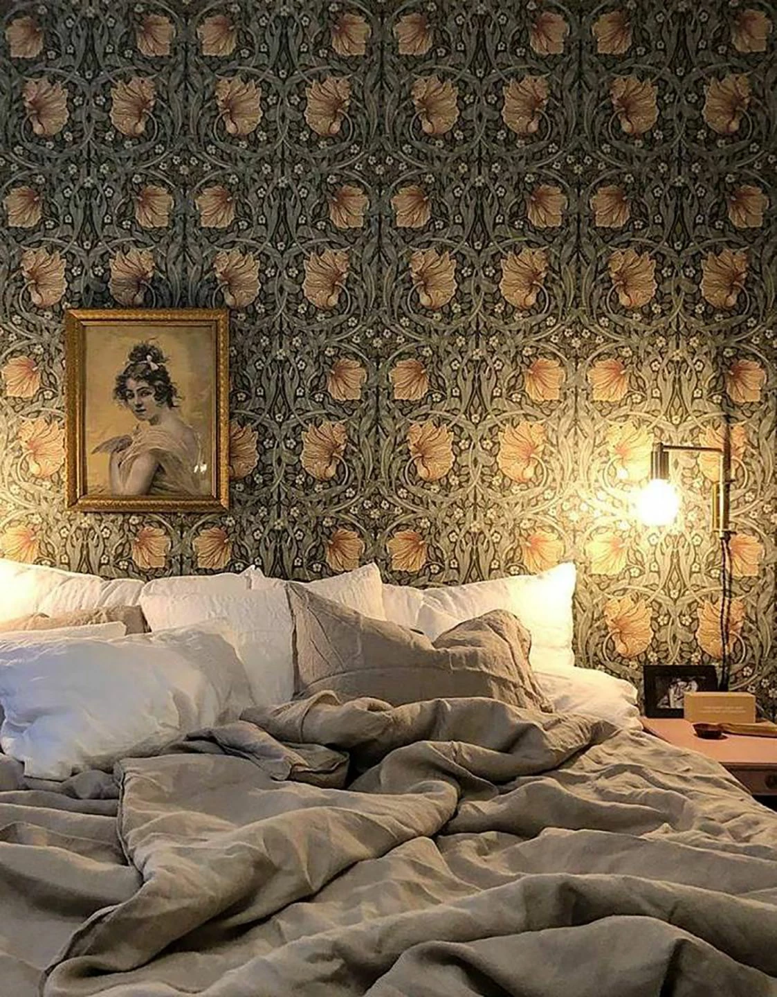 Große Blüten, die sich vom Betrachter weg drehen und ihr Geheimnis für sich behalten, umrankt von Blättern und Blumenranken: das historische Design der hochwertigen Papiertapete im Jugendstil geht auf den britischen Designer William Morris zurück und strahlt gleichzeitig Üppigkeit und Symmetrie aus. Sie erhalten die Tapete in drei weiteren Farbvarianten.