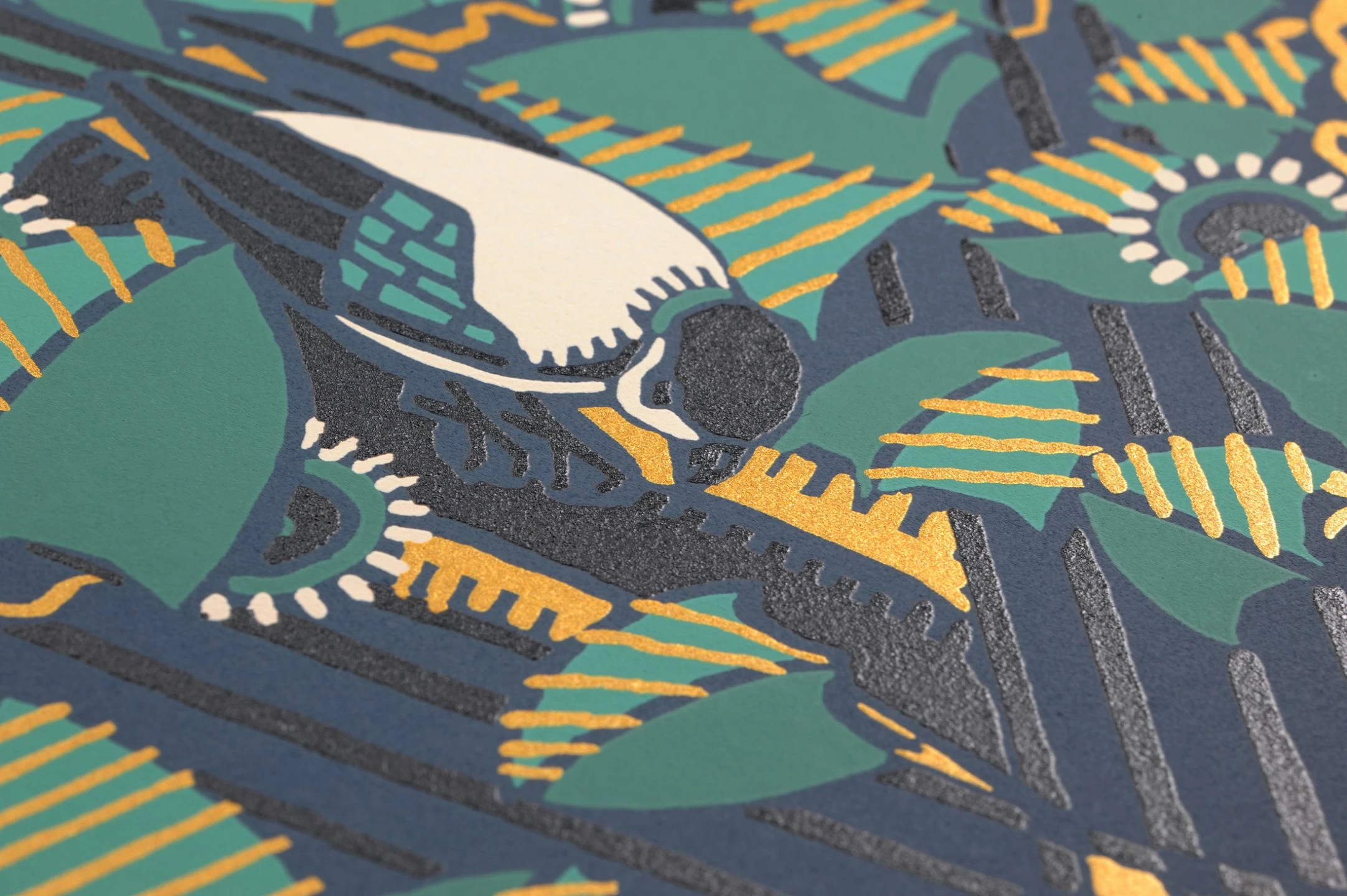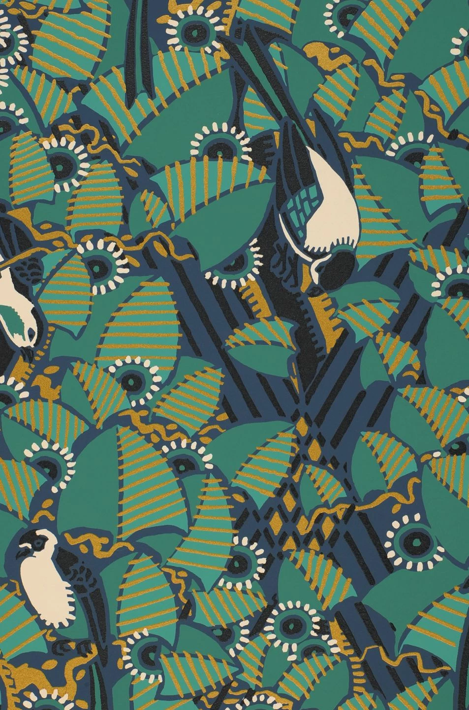 Eine Schwalbe macht noch keinen Sommer – aber wo sich so viele an Schwalben erinnernde stilisierte Vögel versammeln, kann die warme Jahreszeit nicht weit sein! Umgeben sind sie von einer wahren Fülle stilisierter Blüten und Blätter in Grüntönen. Leuchtendes Perlgold setzt auffallende Akzente. Alles in allem ist das lebhafte Design der exklusiven Art-Deco-Tapete ein Bekenntnis zur Lebensfreude. Langweilig wird es in Ihrem Zimmer damit sicher nicht!