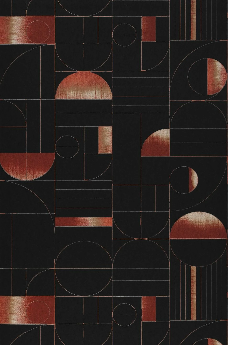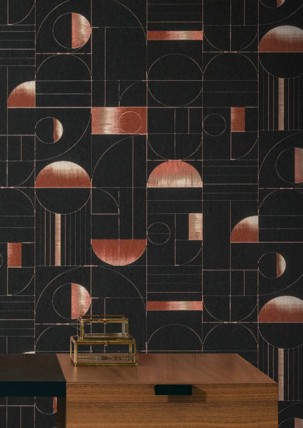 Geometrische Elemente, angelehnt an den Bauhaus-Stil, öffnen Raum und Geist für die Zukunft der Gegenwart. Ein wenig Astronomie und Sternenschau ist auch dabei, lässt sich doch eine Verbindung zum galaktischen Universum herstellen. Am schwarzen Firmament strahlen die Halbkreise wie Halbmonde in kupferähnlicher Textur. Herrlich anregend und modern.