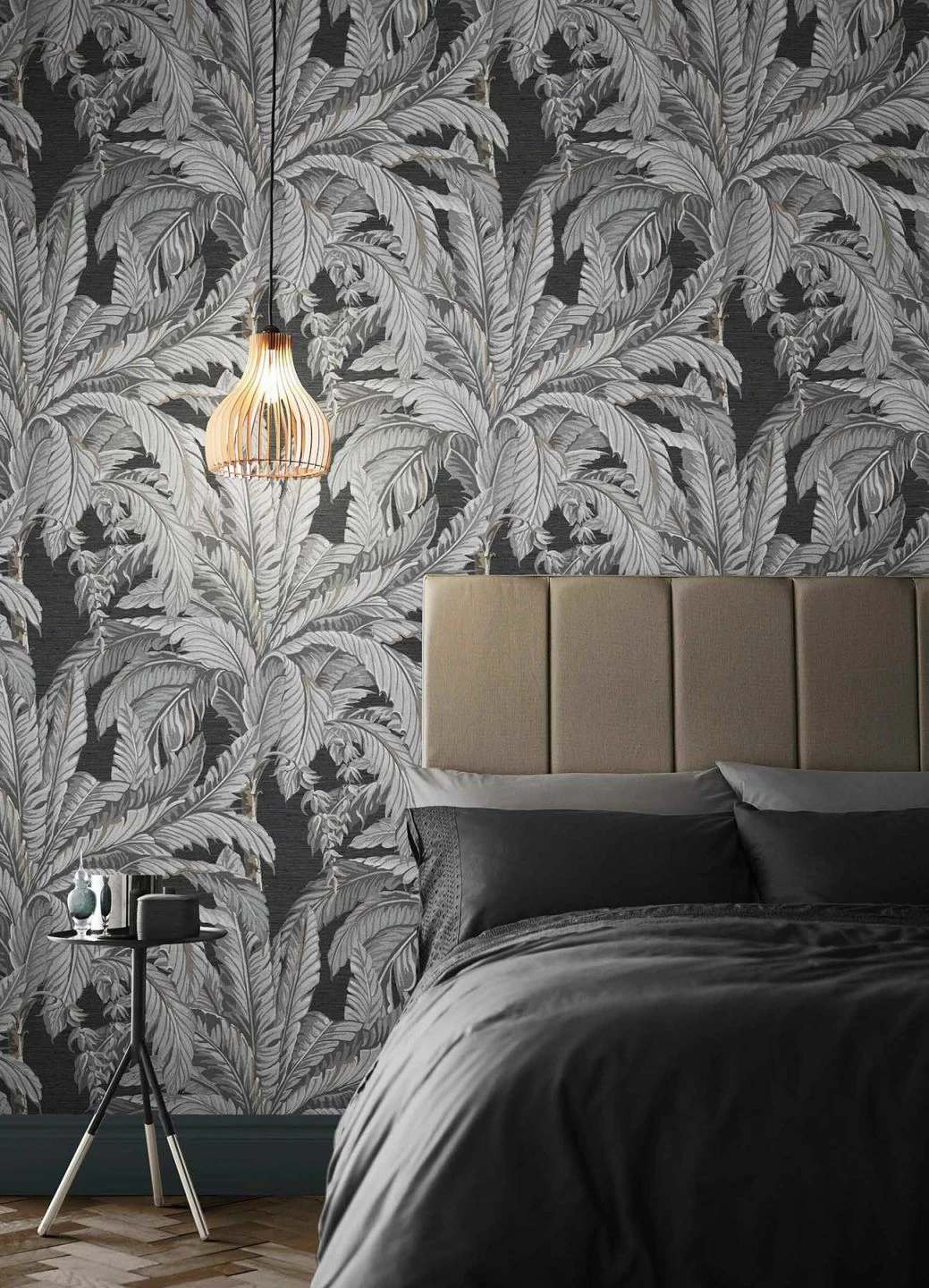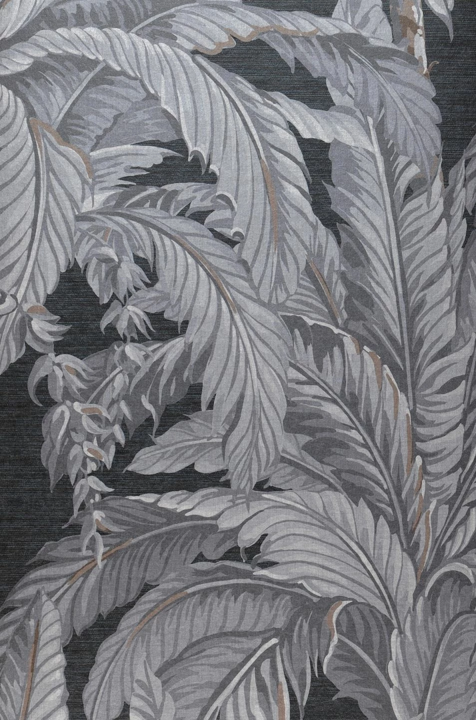 Die Grautöne, in denen die Tapete gestaltet ist, bilden einen ausgeprägten Kontrast zur üppigen Vegetation, die darauf abgebildet ist, und lässt die Palmblätter geheimnisvoll wirken. Blasses Braun liefert räumliche Tiefe, während mattes Silber schöne Akzente setzt. Mit Einrichtungselementen in Grautönen, Schwarz und Weiß setzen Sie das Design der Tapete stimmig in Ihrem Raum um. Aber auch der Kontrast kräftiger Farben ist eine tolle Möglichkeit, „Eden“ in Szene zu setzen.