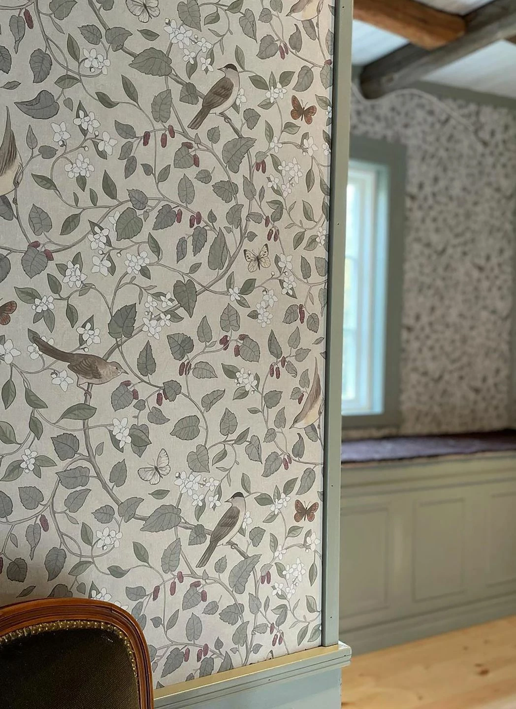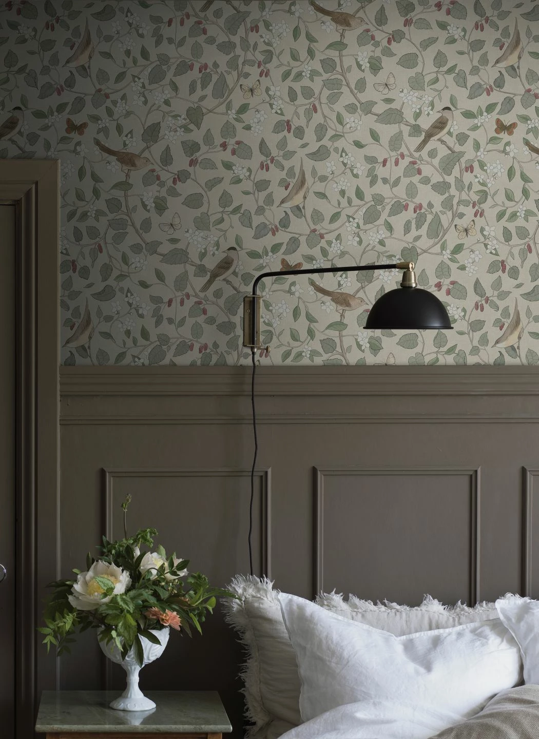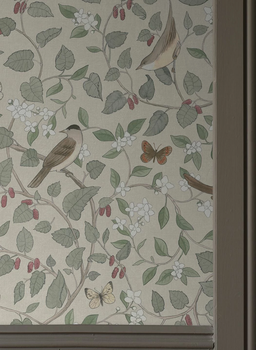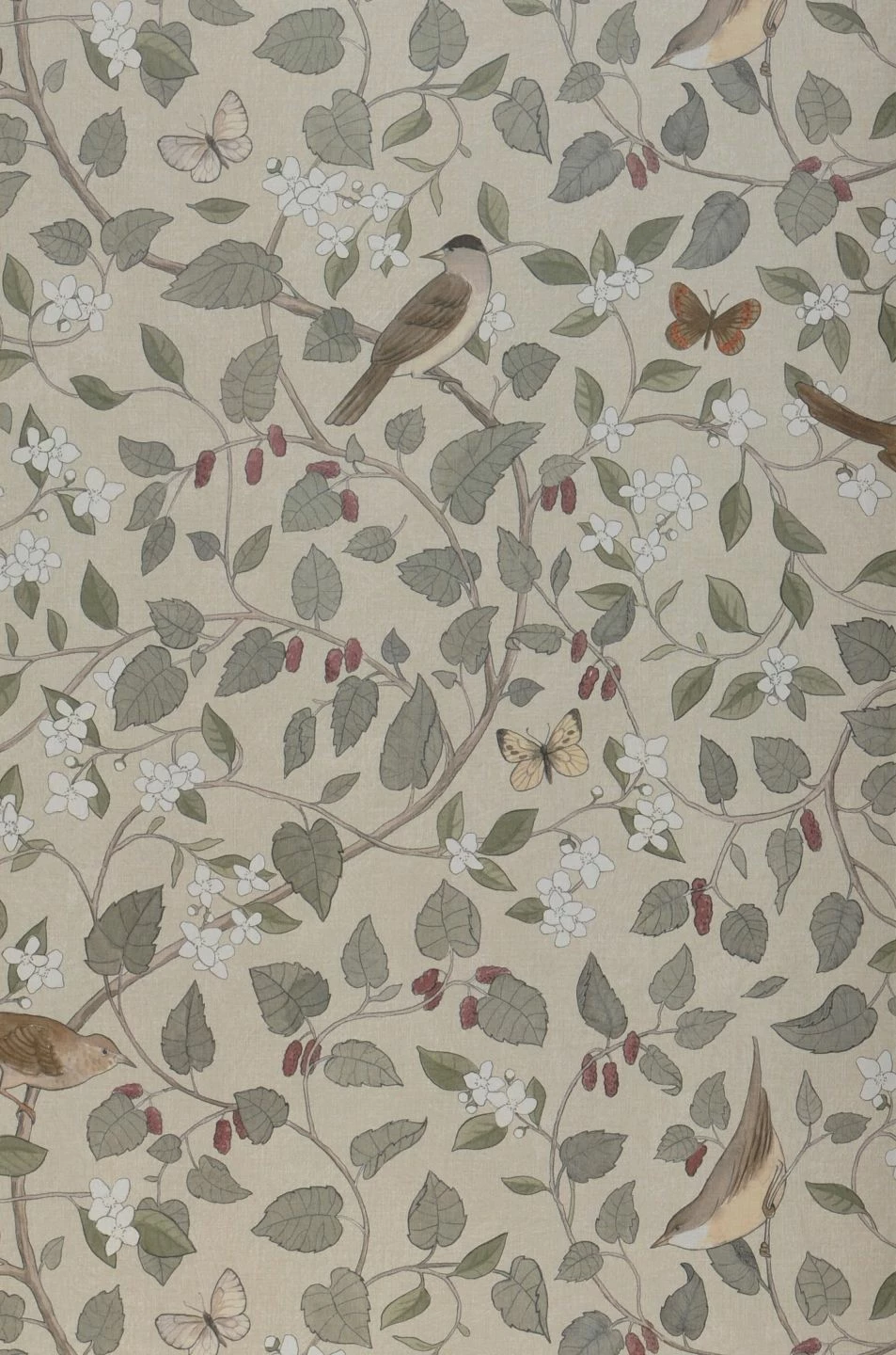 Eine botanische Tapete mit einer großen Portion von nostalgischem Schick ist Elisa. Auf geschwungenen Zweigen mit Blättern, Blüten und reifen Früchten sitzen Singvögel, dazwischen flattern Schmetterlinge. Die verwendeten Beige- und Grautöne und das Weinrot der Beeren harmonieren wundervoll mit dem hellgrauen Grund und schaffen ein attraktives Ensemble, das Vintage-Einrichtungen oder dem skandinavischen Stil eine besondere Note verleiht.