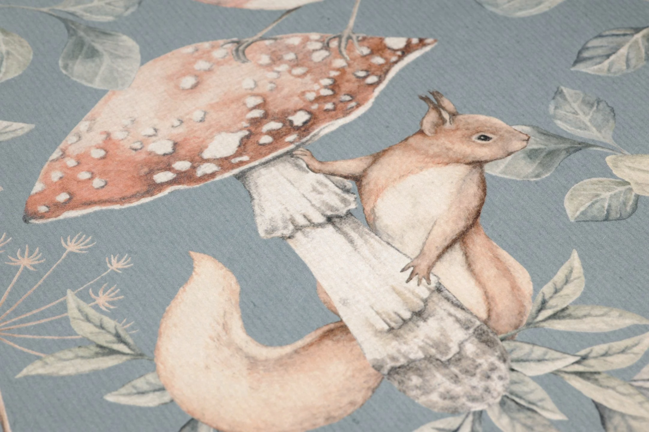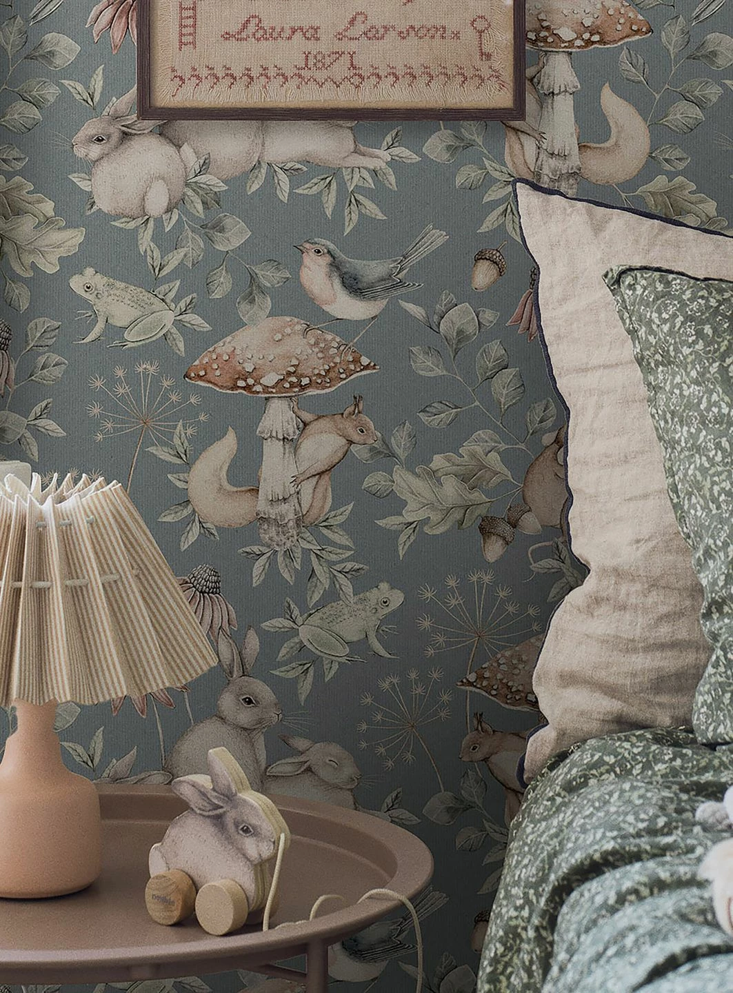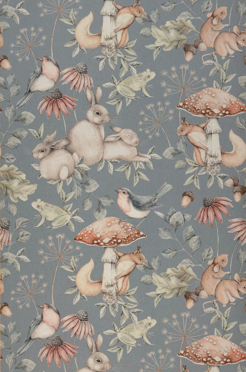 Eine freundliche, friedliche Natur macht den Charme von Vliestapete Elsa aus. Auf dem graublauen Grund gibt es viele niedliche Tiere zu sehen: Rotkehlchen und Eichhörnchen, Kaninchen und Mäuse, sogar Frösche tummeln sich zwischen Blättern, Blüten und Pilzen. Wunderschön für ein Kinderzimmer, aber auch in jedem anderen Raum eine faszinierende Ergänzung des freundlich-gemütlichen skandinavischen Einrichtungsstils.