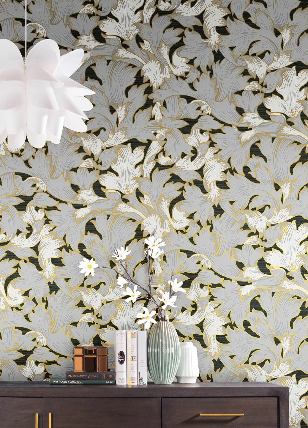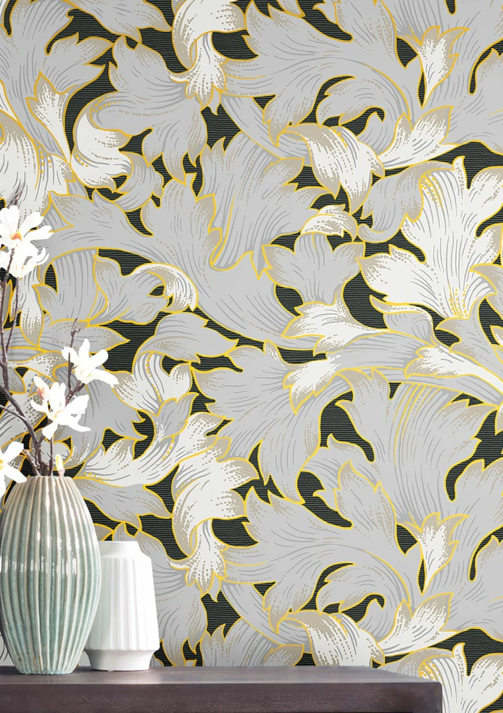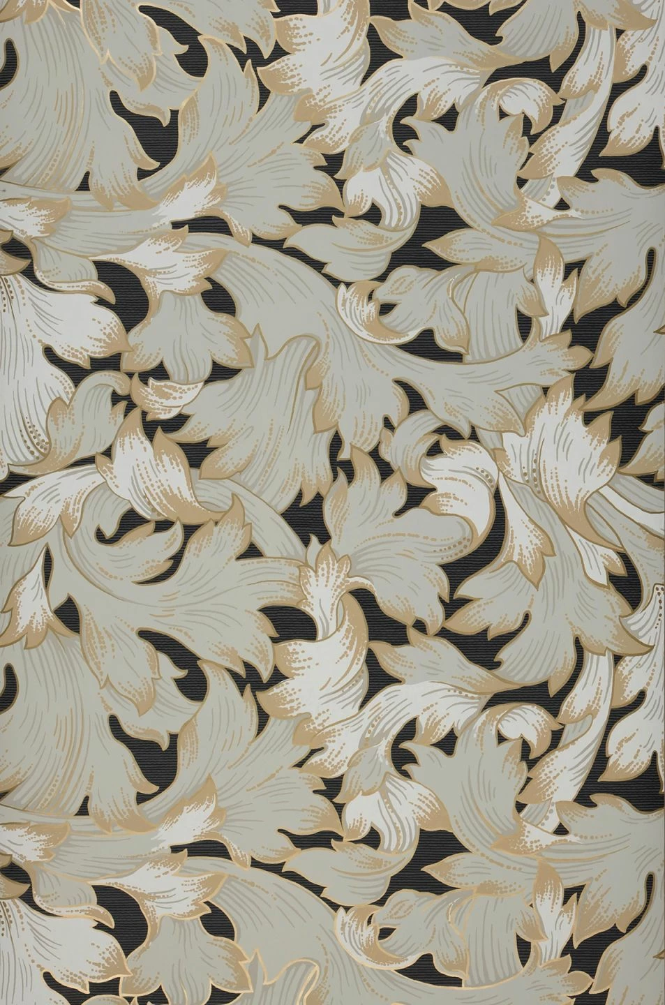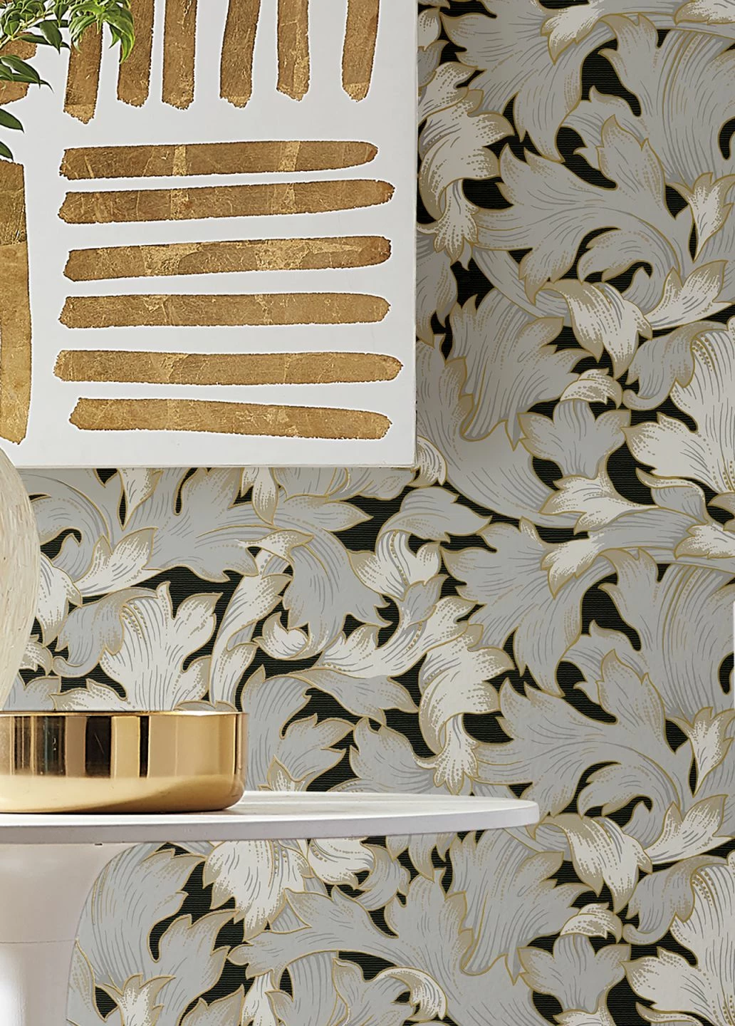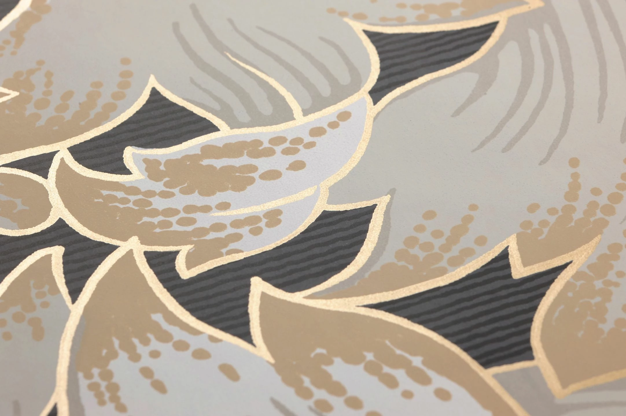Ein helles Grau, klassisches Weiß und ein reizvoller Beigeton sind die Farben der großflächigen Blätter, die sich über die Vliestapete ranken. Abgesetzt mit schimmerndem Gold und versehen mit graphischen Details wie Farbtupfern und zarten Linien, wirken die Blätter dreidimensional und üppig. Der dunkle Hintergrund erhält durch die grauschwarze Schraffur eine wirkungsvolle Struktur.