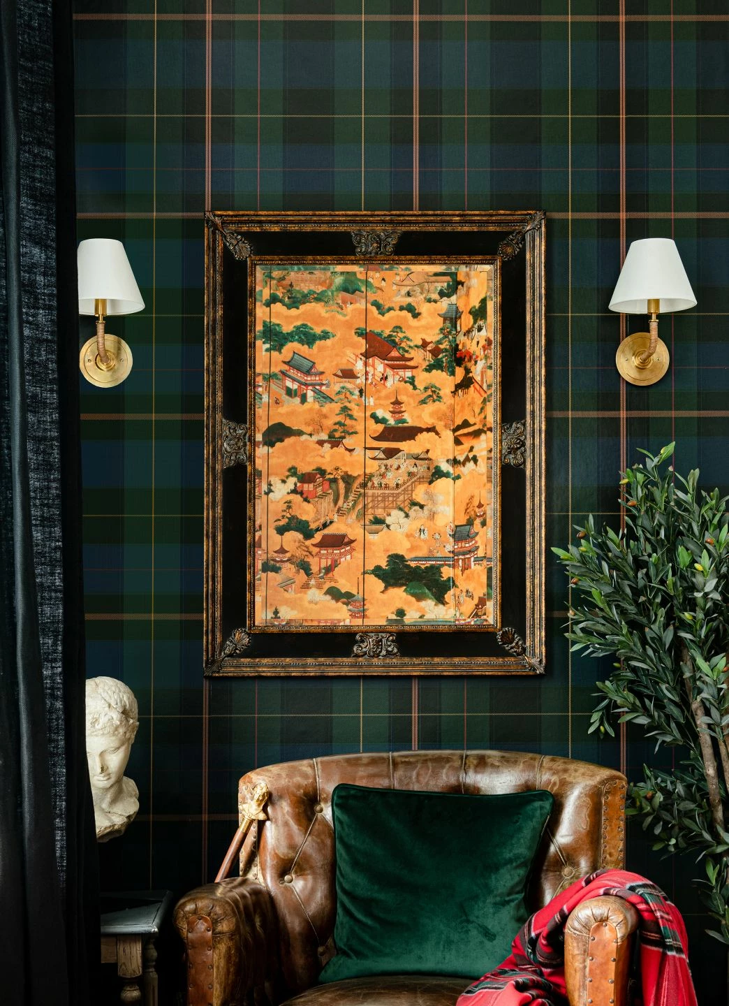 Mit ihrem typischen Tartan-Karomuster imitiert die Vliestapete gekonnt einen gewebten Wollstoff. Die Textil-Imitation verströmt wohlige, bodenständige Wärme und gibt mit ihren dunklen Grün- und Blautönen Ihrer Wand eine ruhige, gesetzte Ordnung. Ein heimeliges Kaminzimmer mit gemütlichen Sesseln in einer der Musterfarben gewinnt durch Equestrian Plaid einen britisch angehauchten, stilvollen Charakter.