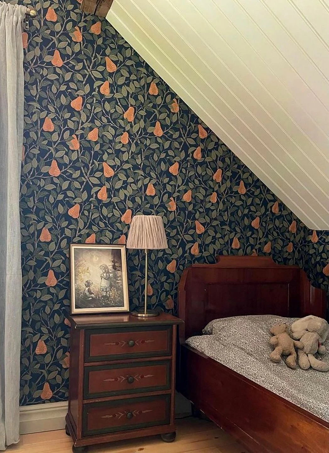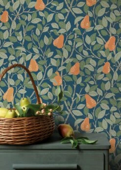 In kräftigem Lachsorange vor dem dunkelblauen Grund scheinen die stilisierten Birnen geradezu von selbst zu leuchten und heben sich von den laubgrünen und schilfgrünen Blättern wunderschön ab. Die starken Farben bilden eine ausdrucksvolle Kulisse, egal ob in Ihrem Wohnzimmer, der Essecke oder in Ihrer Küche. Kombinieren Sie eine der Musterfarben oder schaffen Sie einen schicken Kontrast mit Möbeln in Naturholztönen.