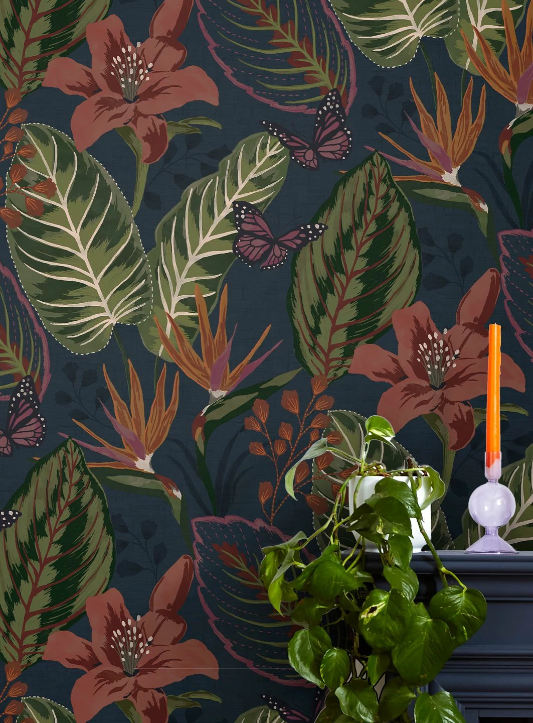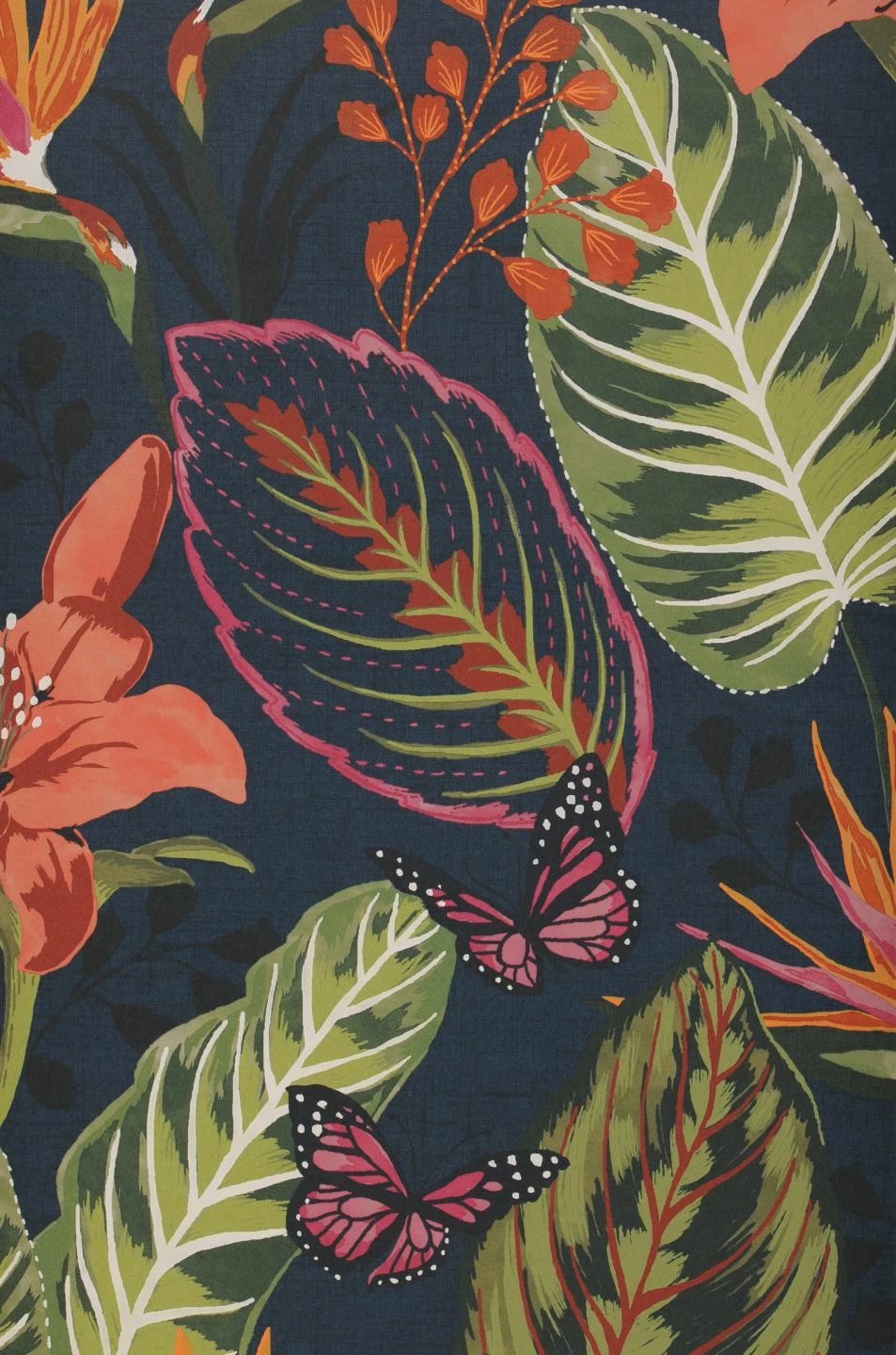 Auf dem dunkelblauen Grund, der an die laue Dunkelheit einer Tropennacht erinnert, gewinnen die Farben der exotischen Pflanzen mit ihren kräftig gemusterten Blättern und den phantastisch geformten Blüten eine ganz eigene Ausdruckskraft. Dunkle Rot-, Orange- und Violetttöne beschwören mit ihrer intensiven Leuchtkraft die magische Atmosphäre der blauen Stunde herauf und lassen Sie den Alltag eine kostbare Zeitlang vergessen.
