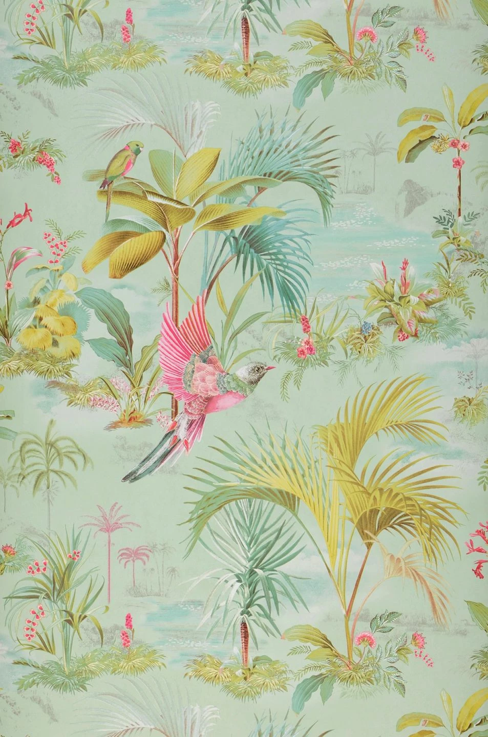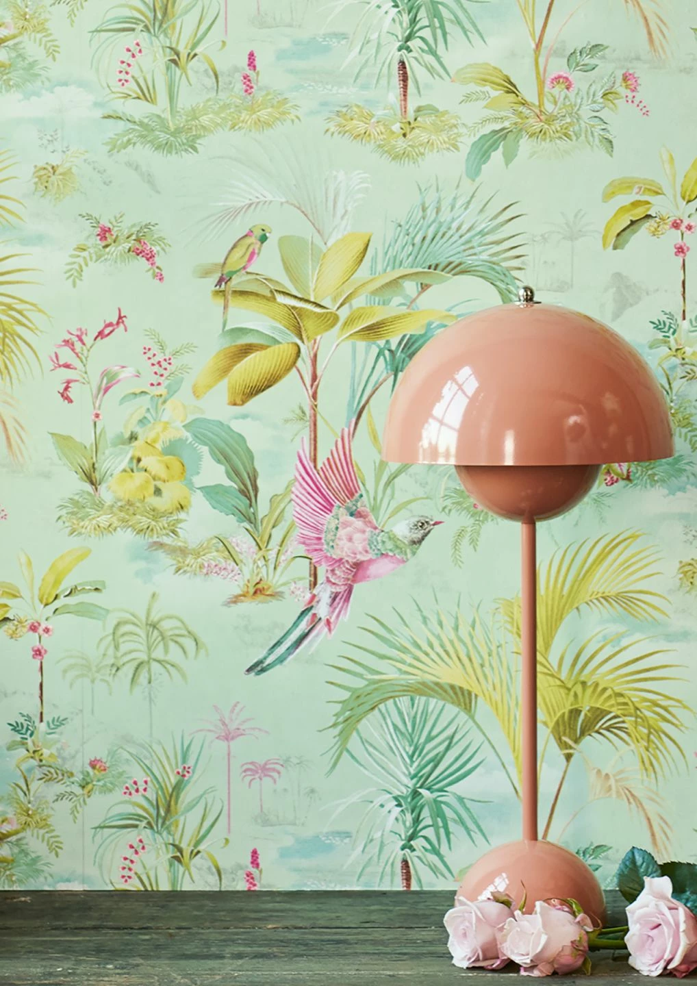 Zwischen üppigen Palmwedeln und tropischen Blattpflanzen ist das Meer zu erahnen. Bunte Vögel und exotische Blüten in verschiedenen Schattierungen von Rosa beleben die von einer breiten Palette von Grüntönen dominierte Landschaft. Die Vliestapete zeigt in sonnigen Farben auf hellgrünem Grund ein wahres Urlaubsparadies. Ideal, um nach getaner Arbeit zur Ruhe zu kommen und vom nächsten Urlaub zu träumen.