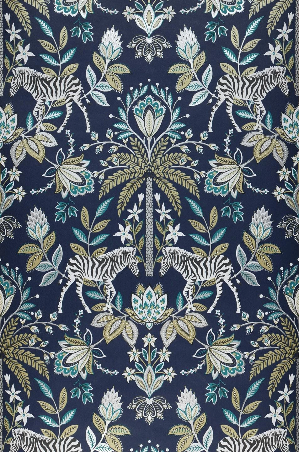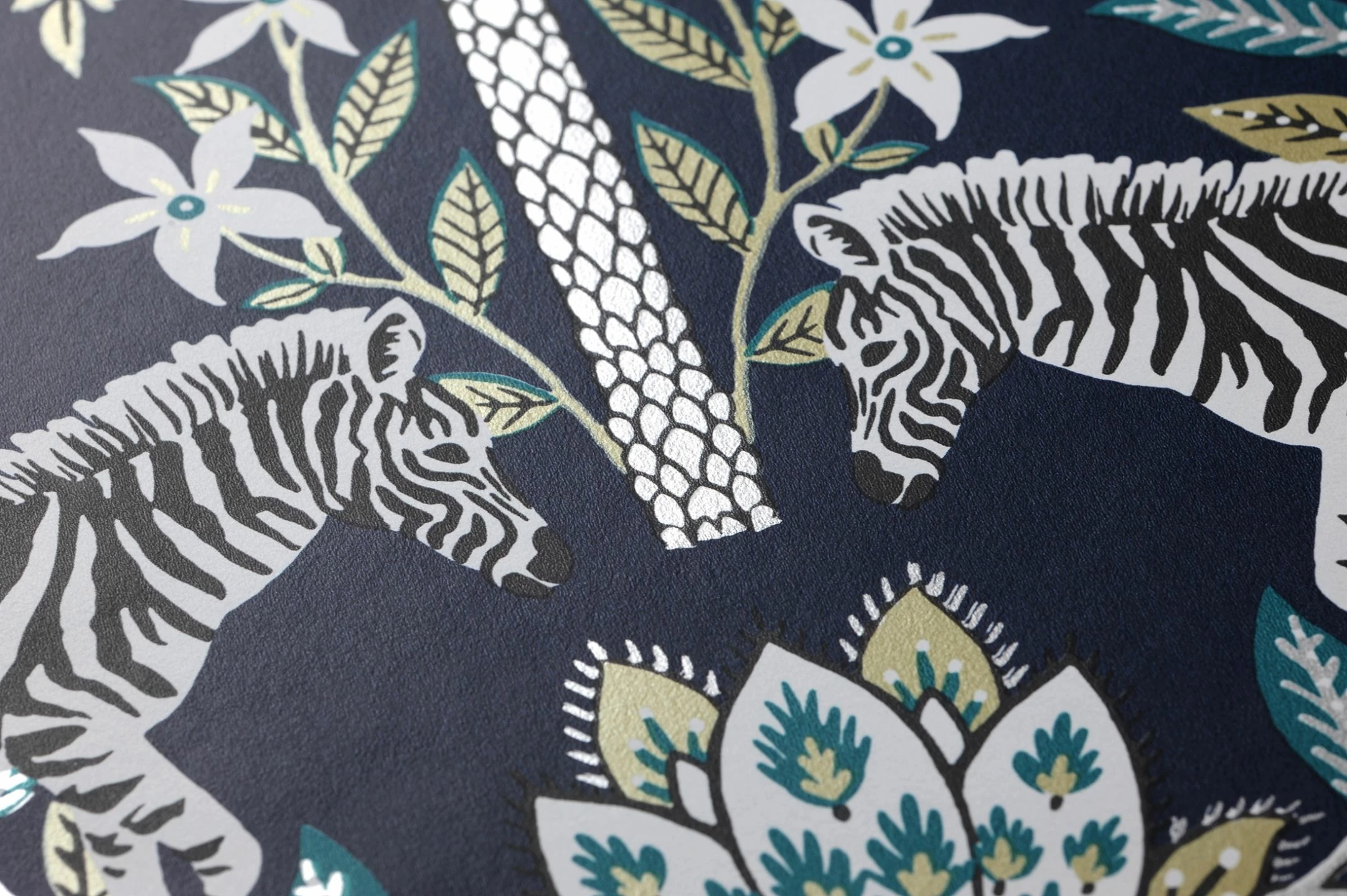 Kunstvoll stilisierte Blüten und Blätter, dazwischen Palmen und Zebras machen aus der Vliestapete „Fento“ einen wahren Augenschmaus. Auf dem geheimnisvolle Tiefe erzeugenden stahlblauen Hintergrund stechen das schimmernde Grünbeige und Silber besonders hervor. Die Symmetrie in der Anordnung der Musterelemente verleiht dem exotischen Muster die Anmutung einer klassischen Tapete. Weiße, beige- oder khakifarbene Möbel sind eine tolle Ergänzung.