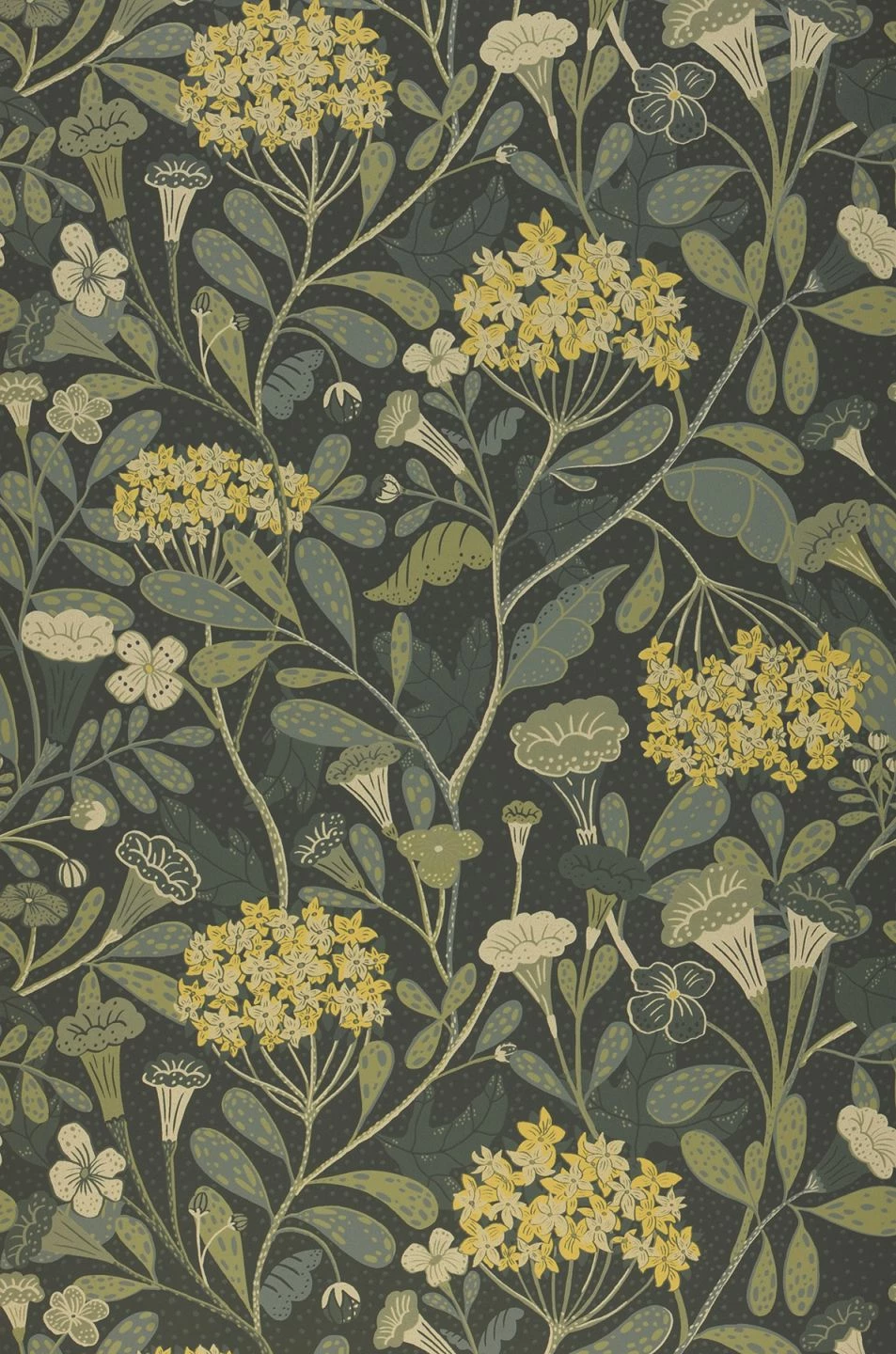 Die verschiedensten Grüntöne, ergänzt durch Gelb und Elfenbein, bestimmen den Eindruck der Vliestapete und erzeugen ein ruhiges, harmonisches Gesamtbild. Zusammengesetzt ist es wie die Artenvielfalt einer Sommerwiese – ein Kaleidoskop von Blütenformen von Dolden über Kelche bis hin zu zarten Knospen rankt sich umeinander und belebt Ihre Wände mit dem Versprechen des Sommers.