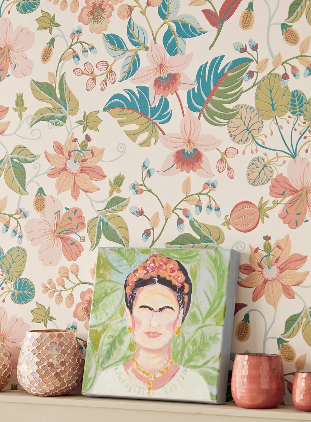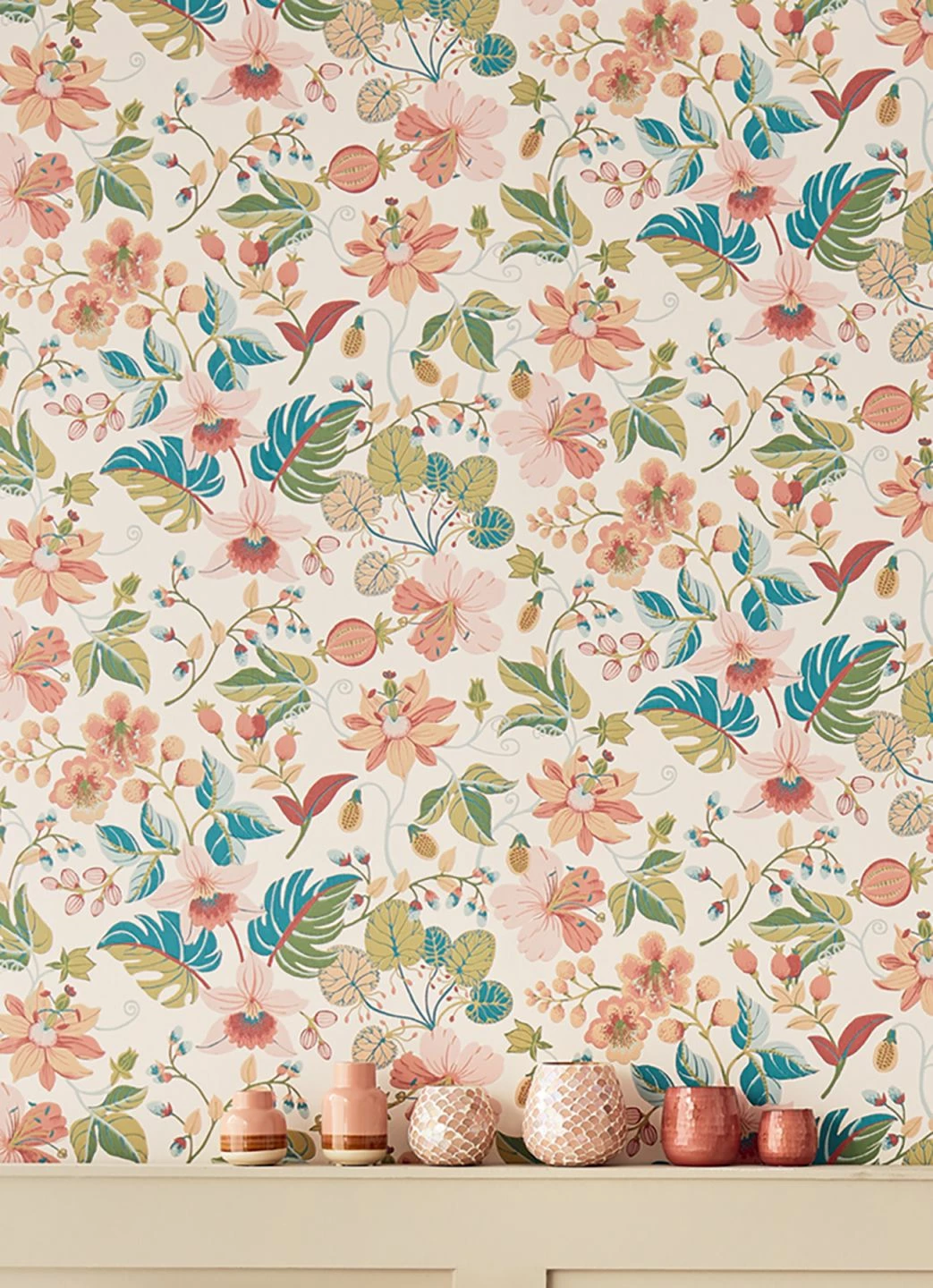 Der mexikanische Frühling wie ihn die Künstlerin Frida Kahlo gerne gesehen hätte, lässt auf diesem Mustertapetenexemplar herzlich grüßen. Tauchen Sie ein in die Welt exotischer Blumen und Früchte, die sich hier zu einem hellen Farbreigen aus Cremeweiß, Beige, Pastelltürkis, Hellrosa, Beigerot, Ozeanblau und Grüntönen vereinen.