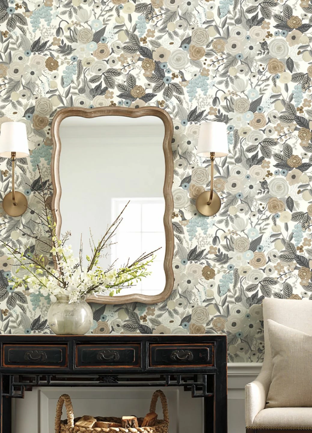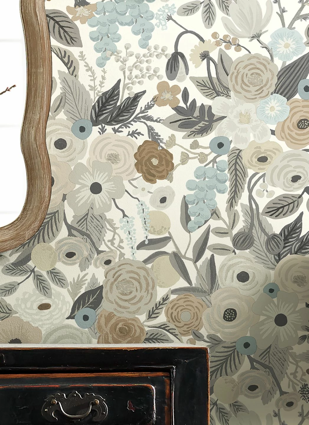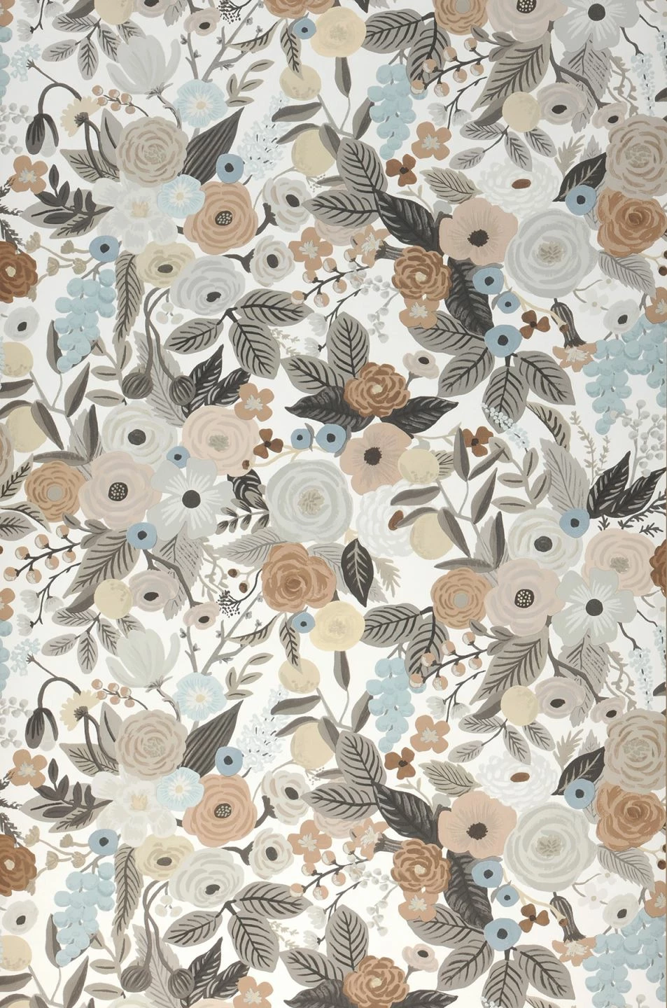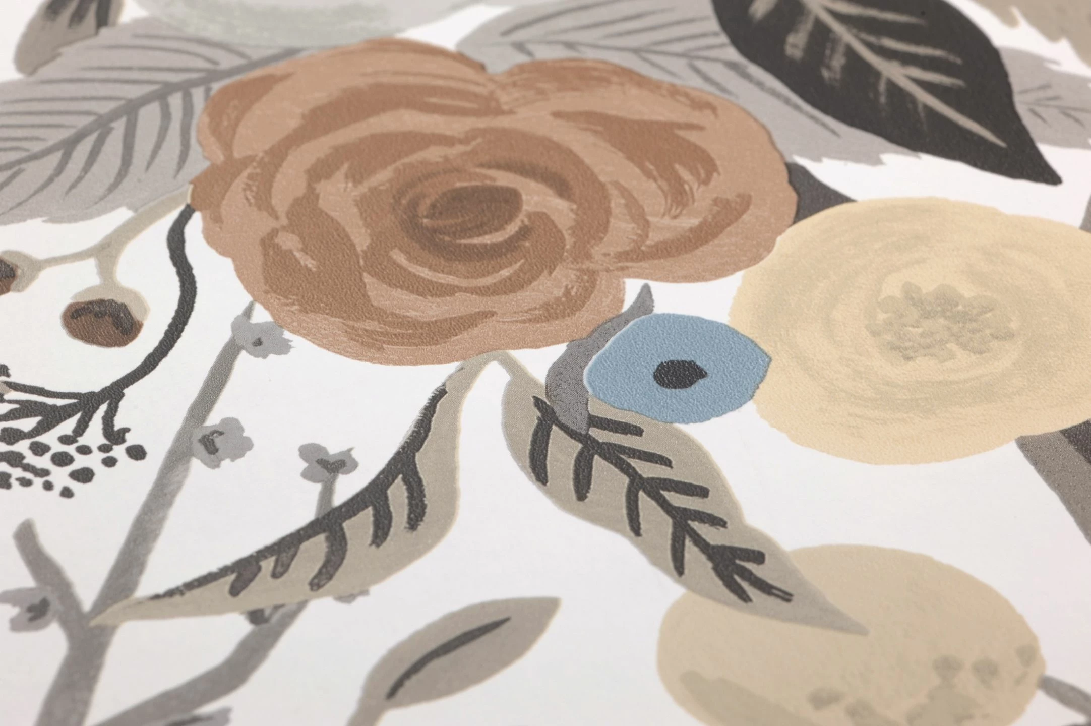 Eine Fülle von Blüten und Blättern in den verschiedensten Formen und Größen erhält durch die Farbwahl von hellen Braun-, Elfenbein-, Grau- und Blautönen inneren Zusammenhalt. Fast wie auf einem alten, sepiafarbenen Foto wirkt die Blütenpracht durch die perfekt miteinander harmonierenden Farben. In Kombination mit einer passenden Wandfarbe entfaltet die Papiertapete ihre ganz besondere Wirkung und passt sich dunklen, historischen Möbeln ebenso an wie dem hellen, skandinavischen Stil.