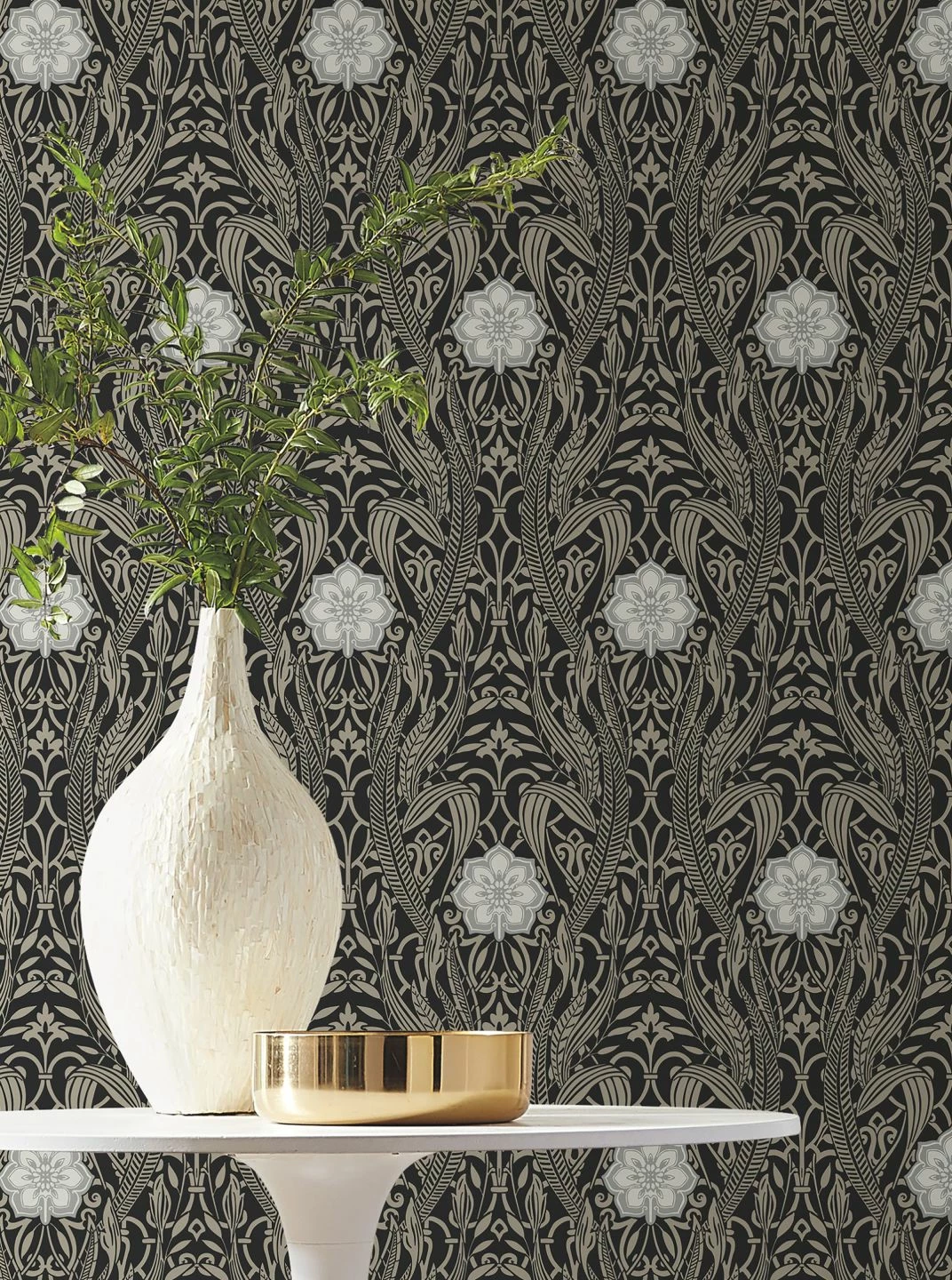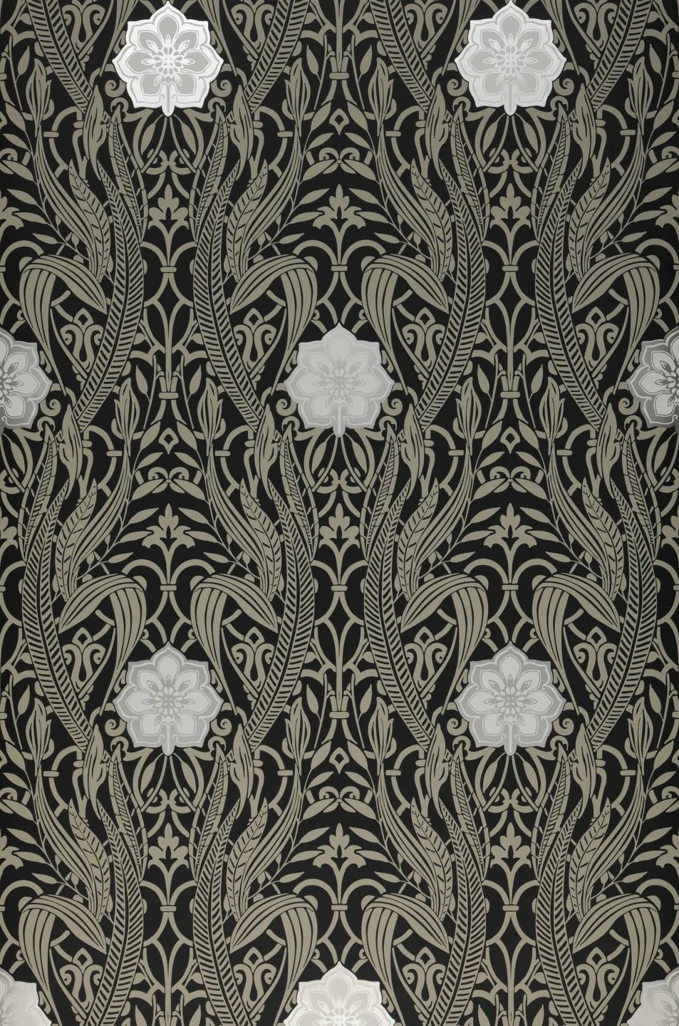 Wie die geschwungenen Verzierungen auf einem kostbaren Märchenbuch umgeben die silbern schimmernden Ornamente aus stilisierten Blättern und Ranken auf schwarzem Grund die Blüten in Weiß und Steingrau. Das Jugendstil-Design wirkt elegant und luxuriös und verströmt einen Hauch von Nostalgie, den Sie mit charaktervollen Möbeln und Deko-Elementen aus der Epoche des Jugendstils wirkungsvoll betonen können.