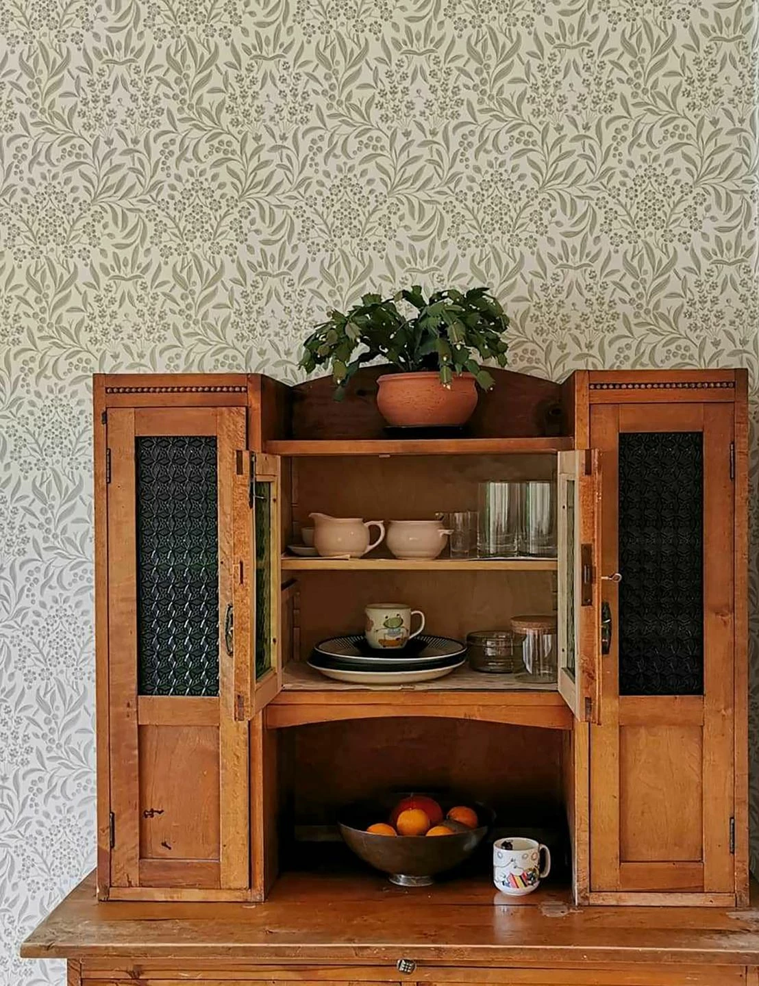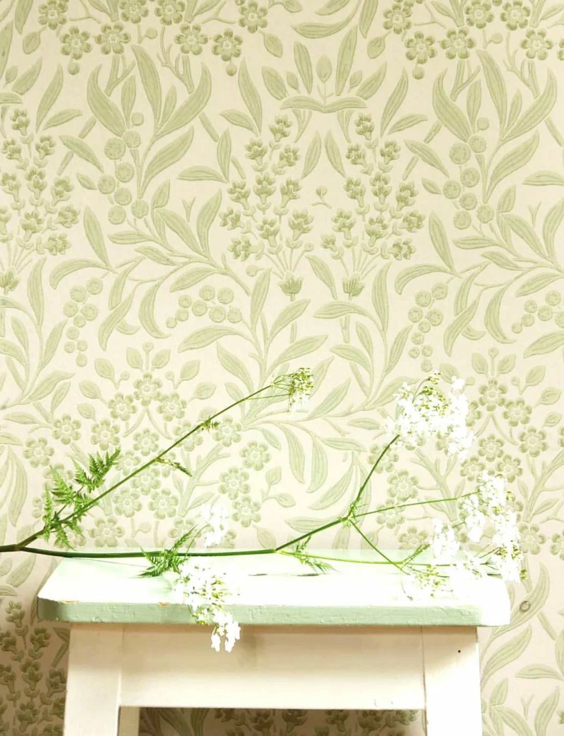 Mit ihren zarten Blattranken und den zierlichen Blüten ist Papiertapete Geraldine wie geschaffen für den freundlichen, einladenden skandinavischen Stil. Die Kombination eines blassgrünen Musters auf cremeweißem Grund wirkt edel und nostalgisch. Hochwertig macht sie auch das Leimdruckverfahren, das die Qualität traditionellen Handwerks ausstrahlt. Helle Möbel oder Naturholz spielen mit Geraldine als Hintergrund ihre Stärken wirkungsvoll aus.